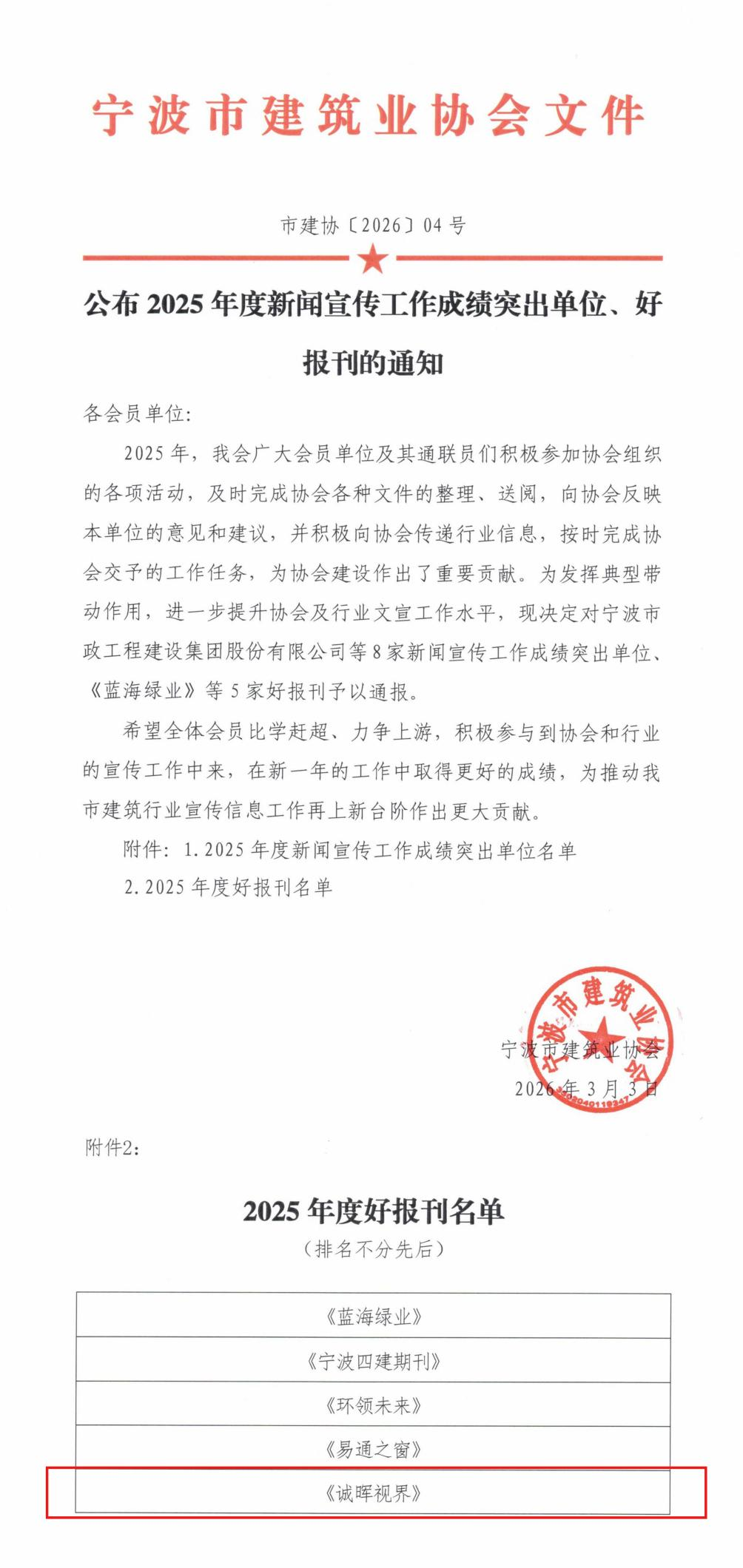 春回大地,万象更新,诚晖集团企业文化建设再结硕果。2026年3月3日,宁波市建筑业协会正式公布2025年度新闻宣传工作成绩突出单位及好报刊评选结果,诚晖集团凭借内刊《诚晖视界》的优异表现,再次荣获“2025年度好报刊”称号。这一荣誉的蝉联,不仅是对诚晖集团企业文化建设成效的充分肯定,也彰显了企业在行业宣传工作中持续聚力的成果。
