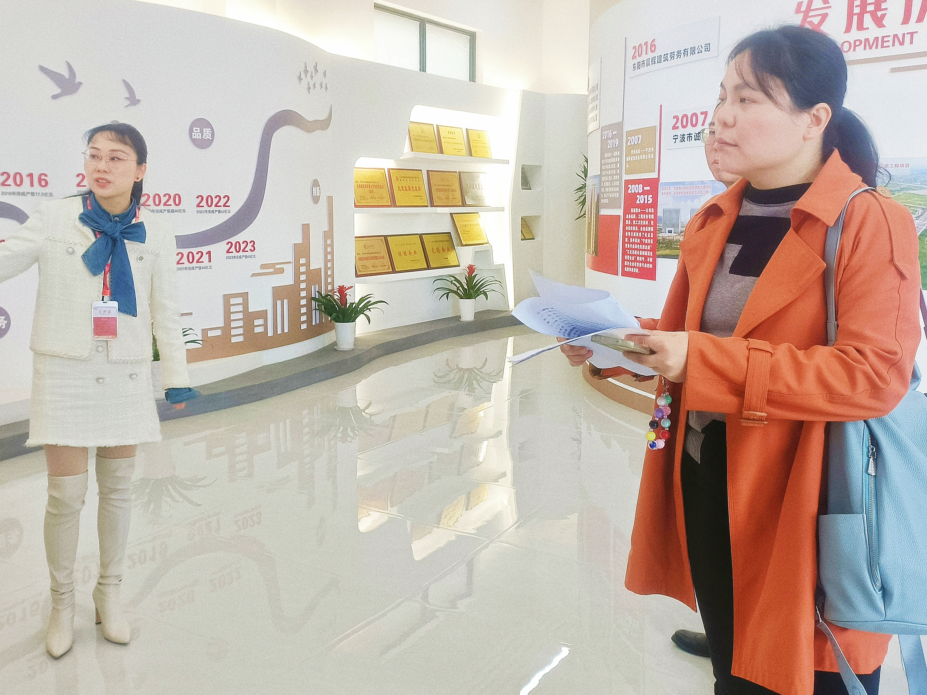 调研组一行参观了集团一楼的文化展厅,部门经理胡雪菲从企业发展历史、企业文化、企业荣誉等方面介绍了集团。随后,由集团副总经理张燕楠为调研组一行介绍了公司作为浙江省产业工人培育的先行企业,为建筑工人的发展以及职业技能的提升做的一系列人才培养及工匠培育的工作,并介绍了诚晖支部的党建活动、公益行动,最后展示了集团自有开发的智慧工地信息化模块,调研组在深入了解后也对我司表达了肯定,并与张总进行了进一步的交流。