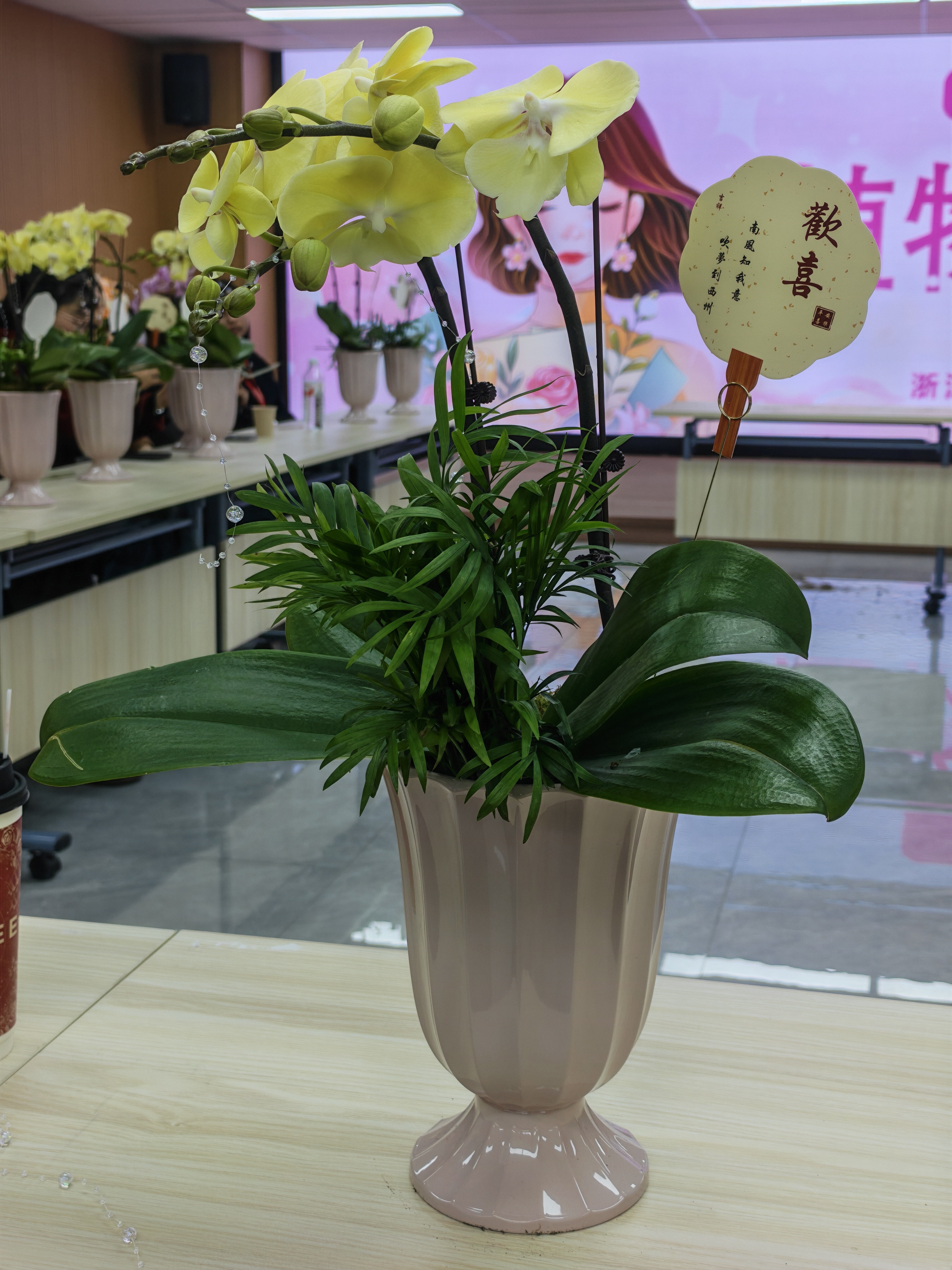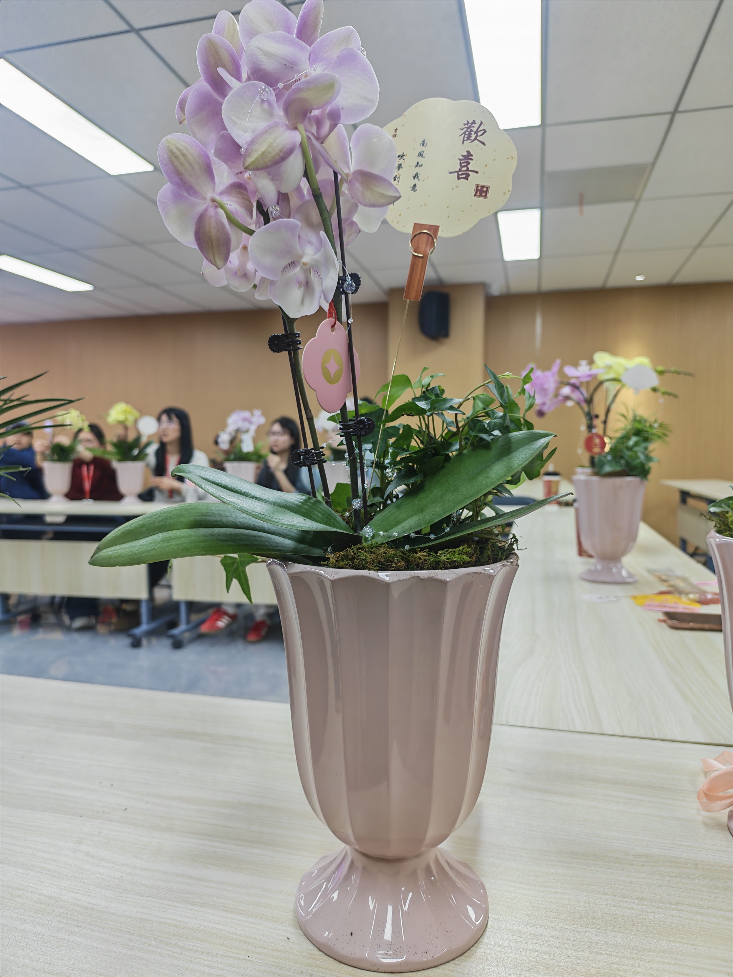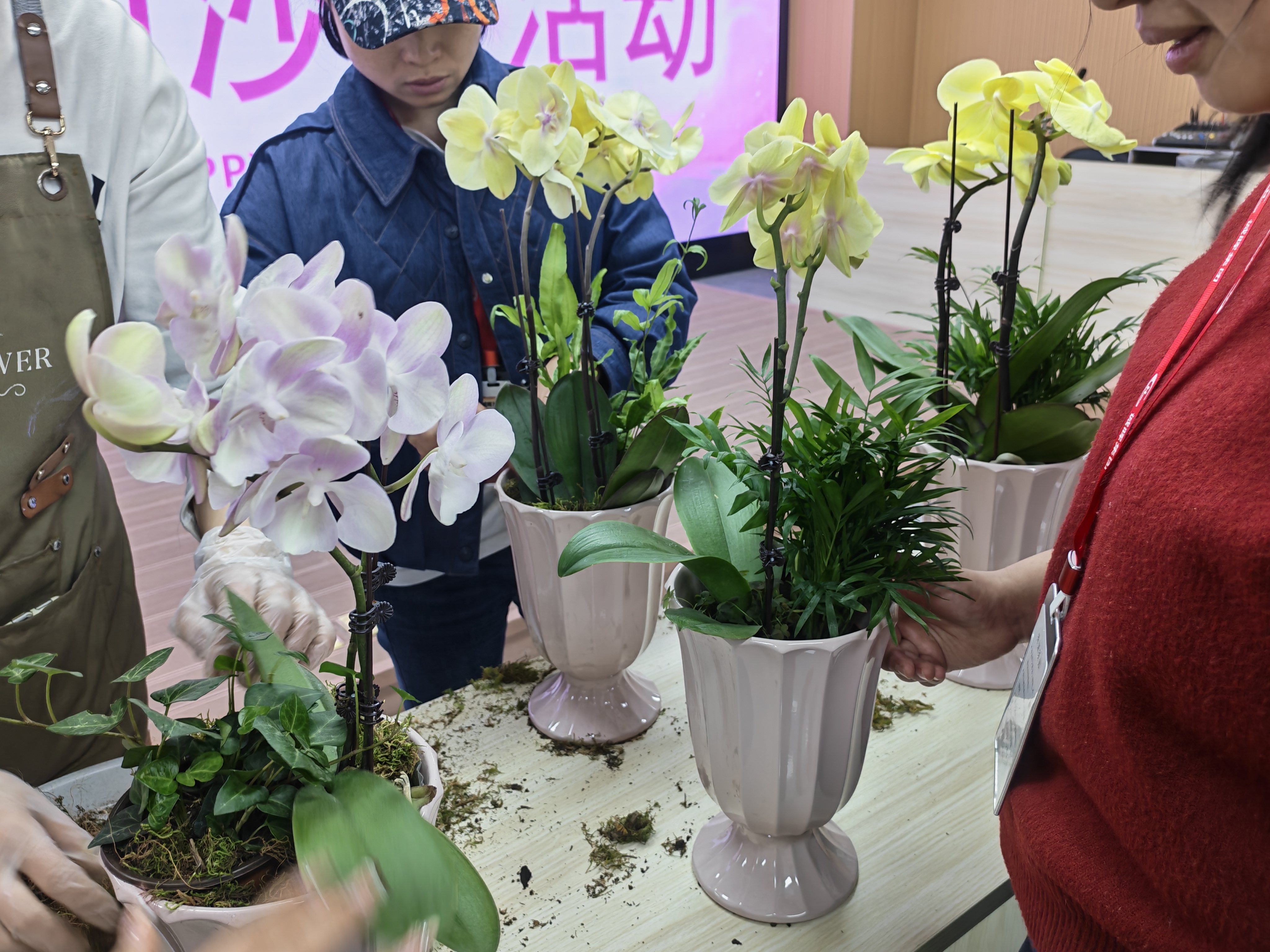 活动在温馨雅致的花艺沙龙中拉开帷幕公司邀请了两位插花老师,带领大家邂逅蝴蝶兰盆栽的清雅之美。从花材选择、色彩搭配,到日常养护技巧,老师们都耐心讲解、细致示范。女员工们认真聆听,动手创作,将一株株蝴蝶兰打造成错落有致、生机盎然的小盆栽。花影绰约间,映照出她们专注而温柔的模样。