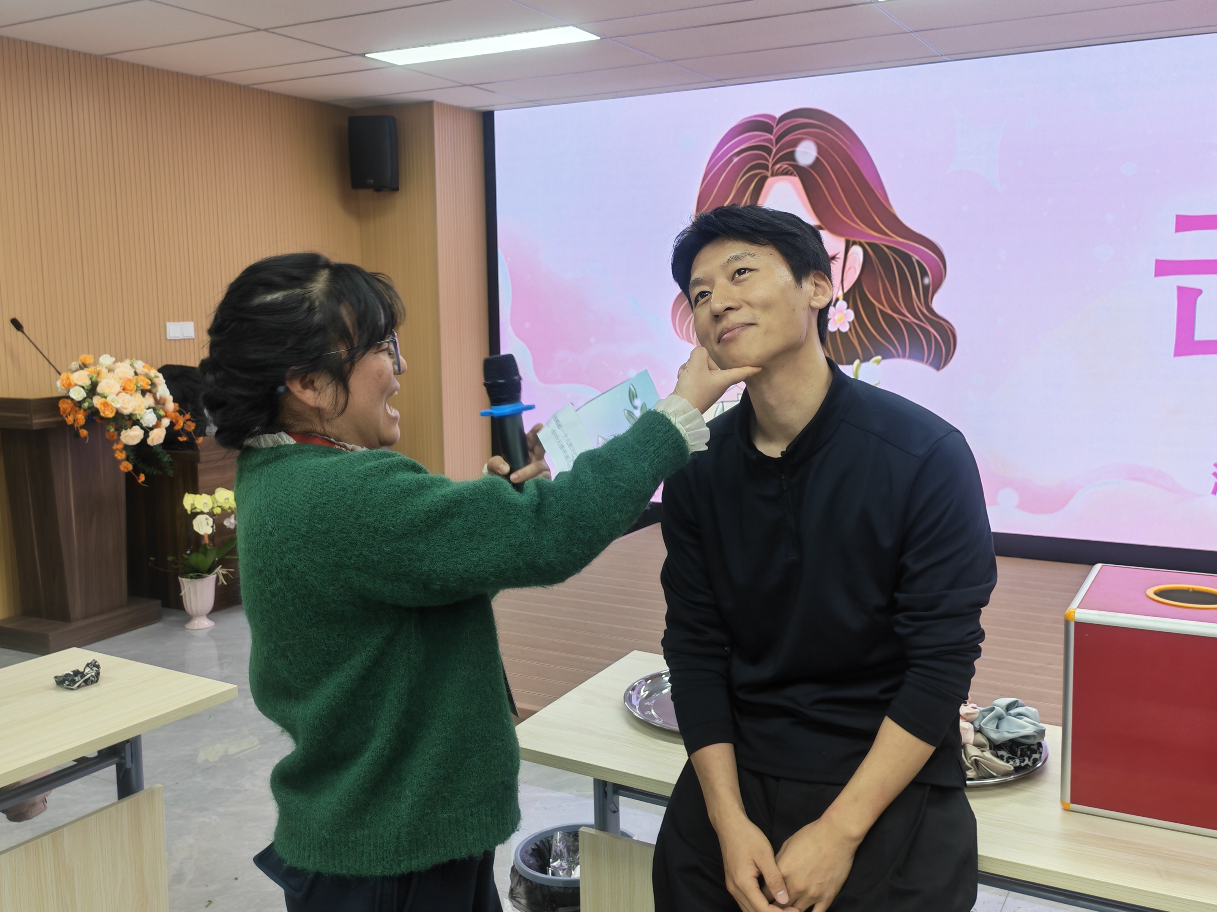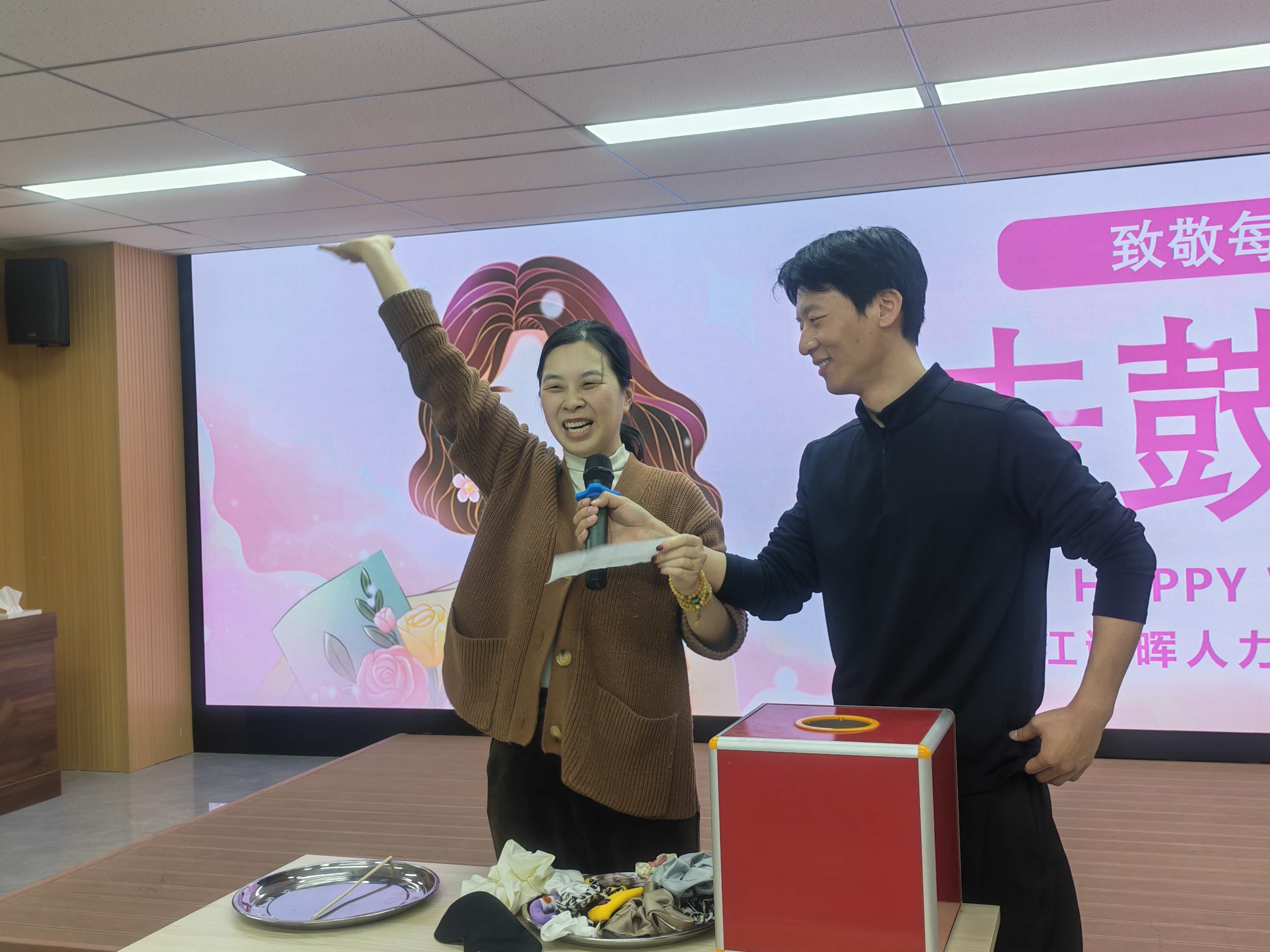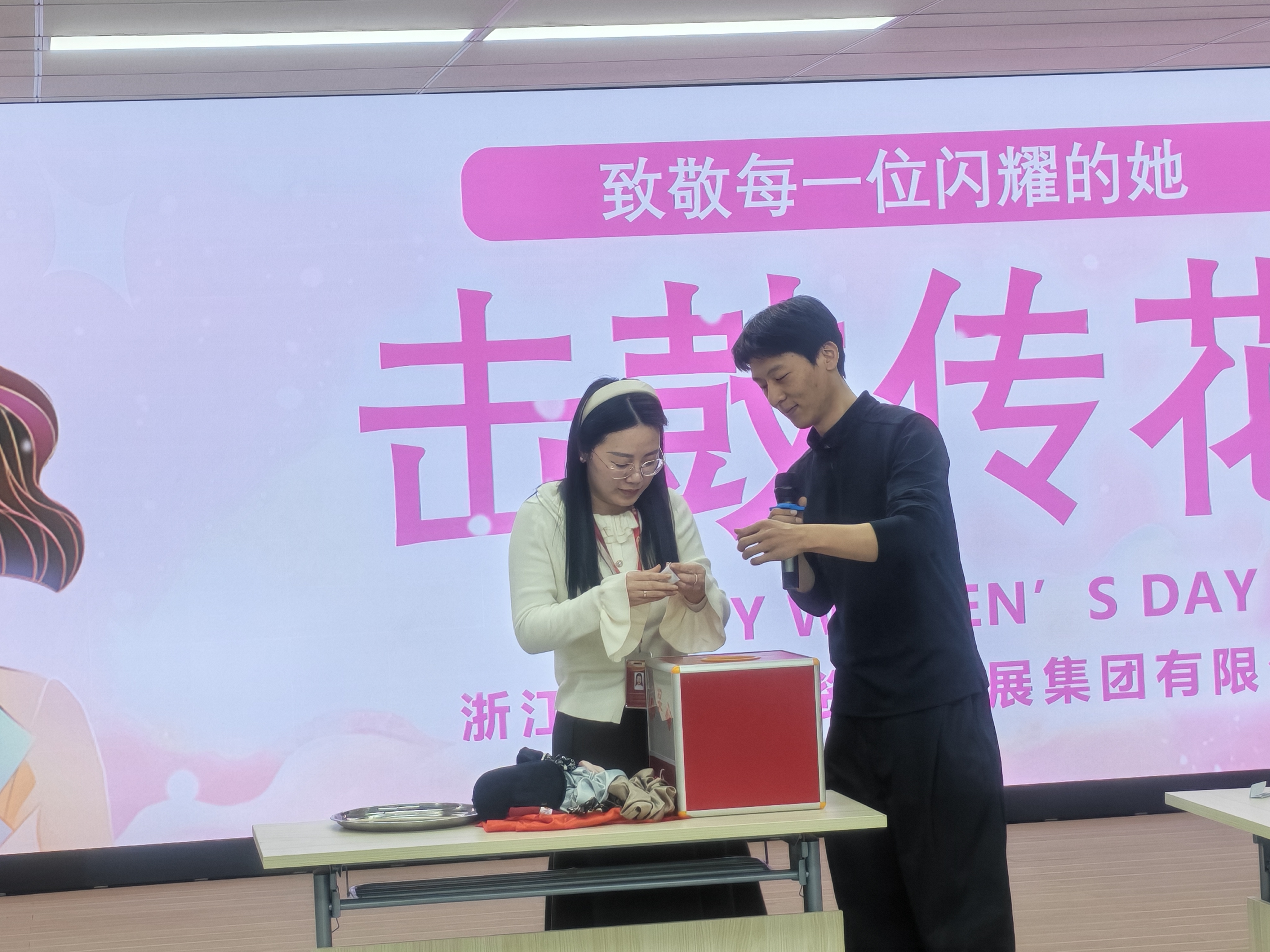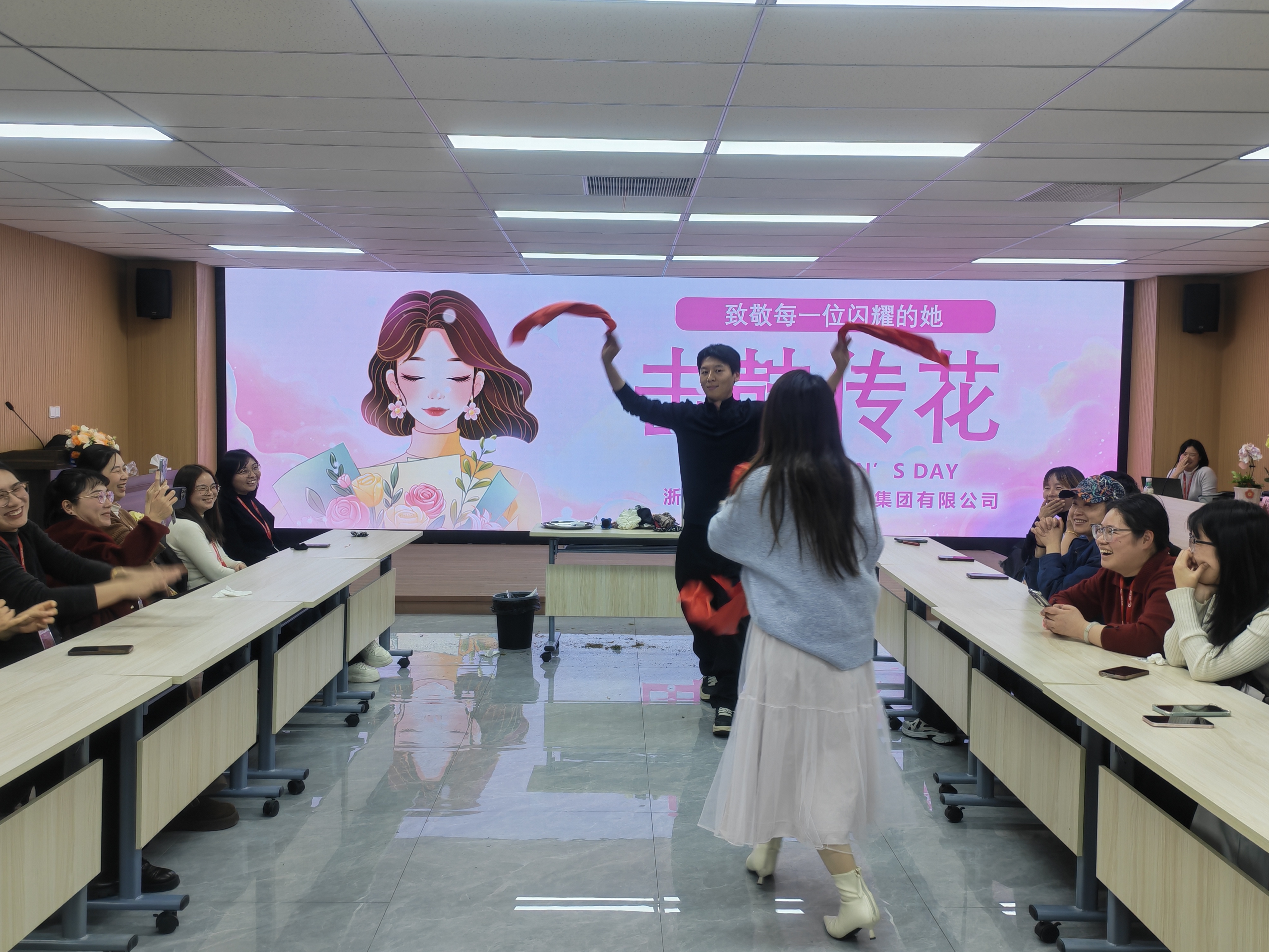 花艺过后,气氛转向轻松热烈。一场趣味十足的“击鼓传花”游戏火热展开伴随着敲锣声,大红花在女职工的手中一一传递,鼓声骤停时,幸运者随机抽取任务,或大方展示才艺与游戏挑战。现场欢声笑语不断,掌声与喝彩声此起彼伏,洋溢着愉悦欢快的氛围。