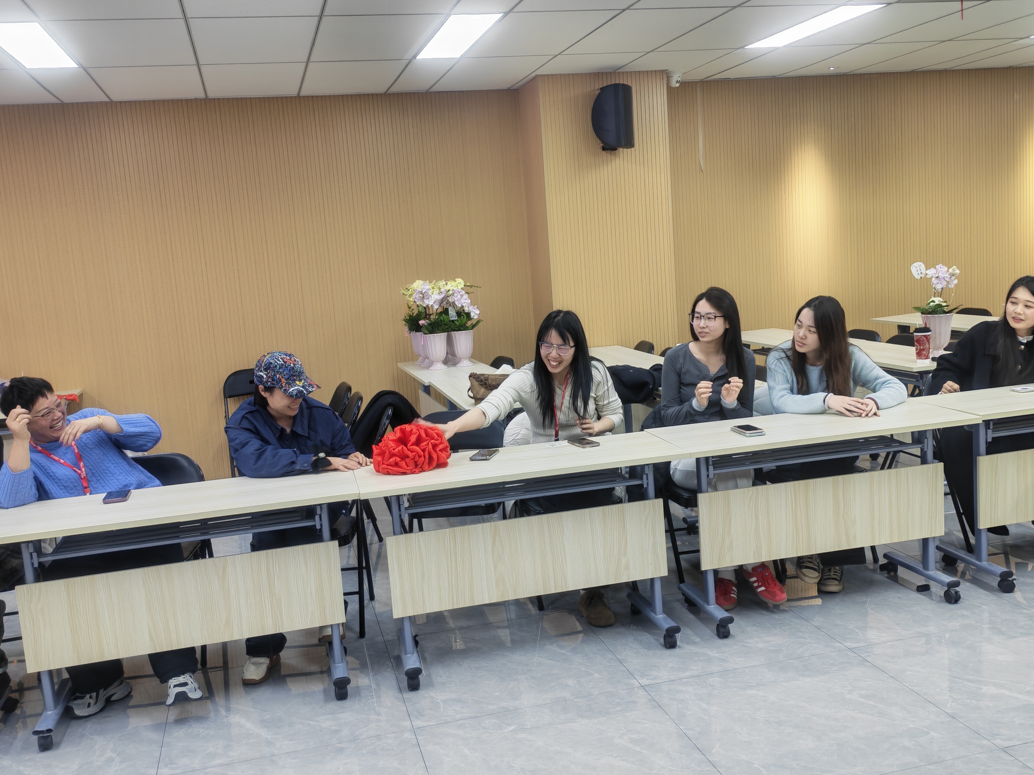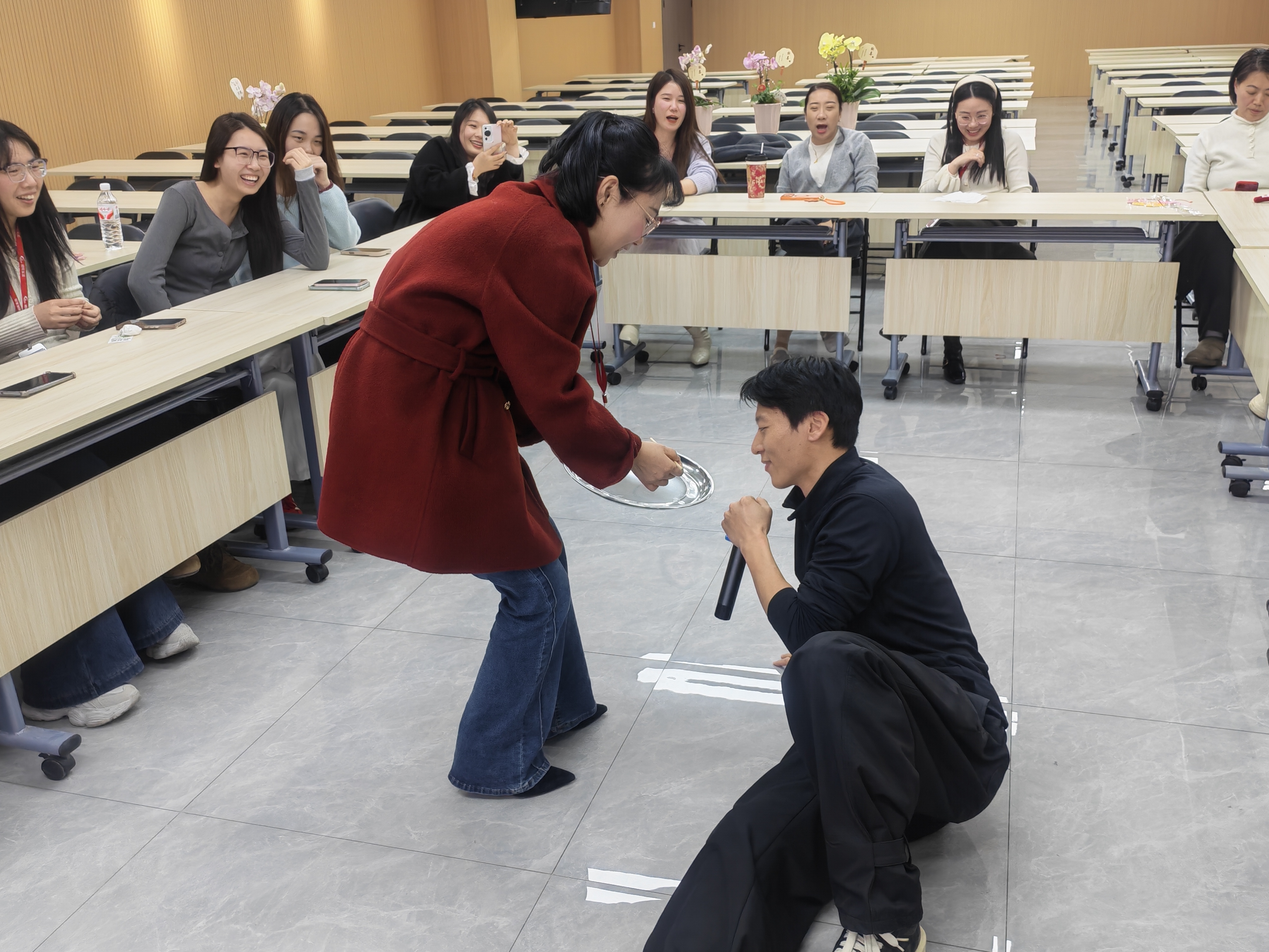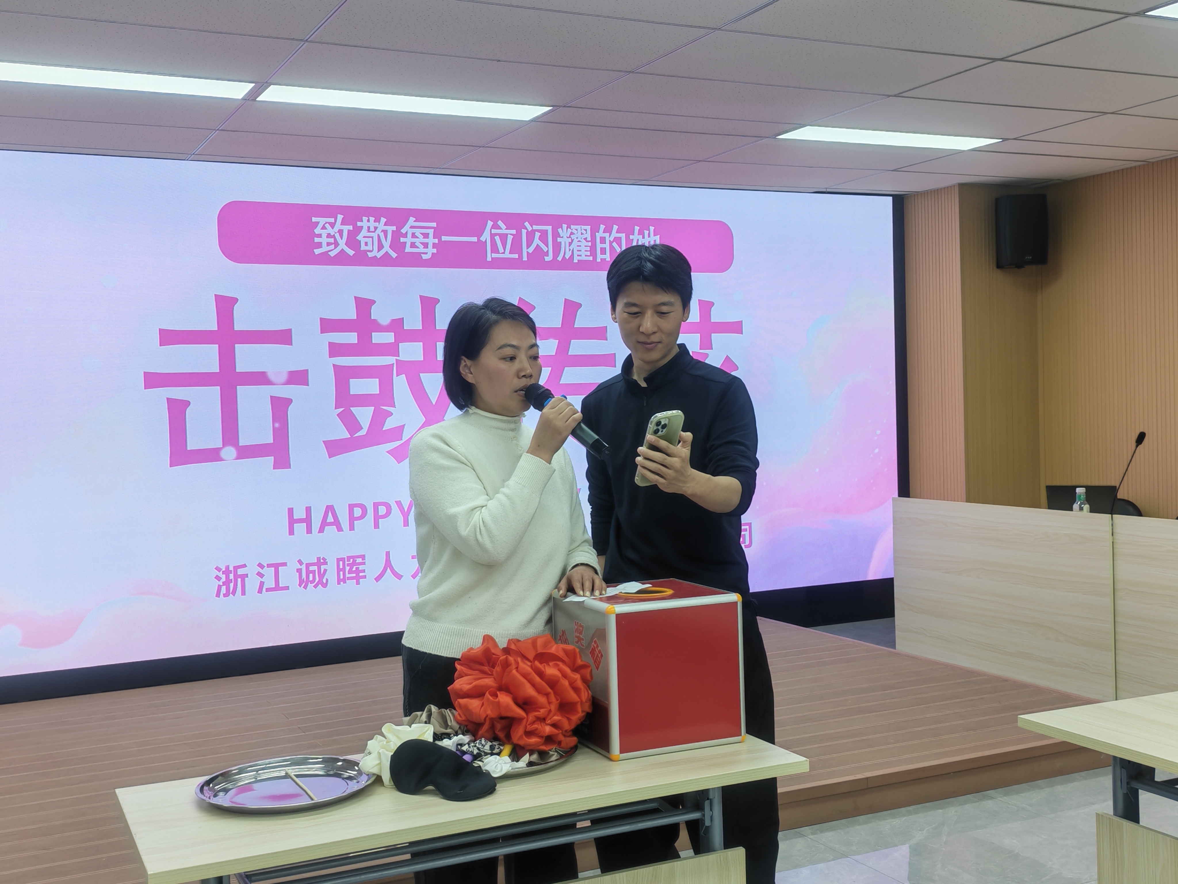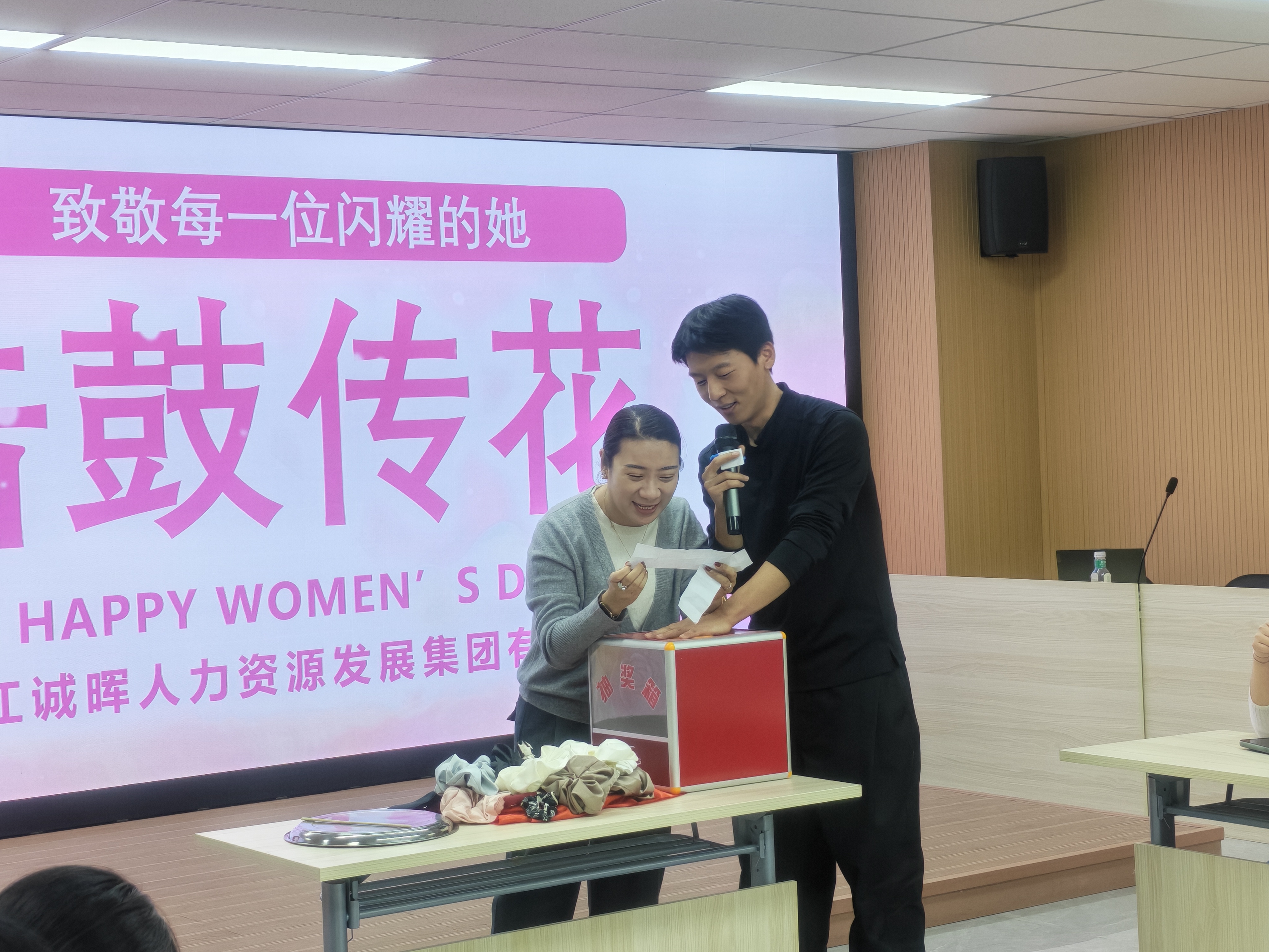 花艺过后,气氛转向轻松热烈。一场趣味十足的“击鼓传花”游戏火热展开伴随着敲锣声,大红花在女职工的手中一一传递,鼓声骤停时,幸运者随机抽取任务,或大方展示才艺与游戏挑战。现场欢声笑语不断,掌声与喝彩声此起彼伏,洋溢着愉悦欢快的氛围。