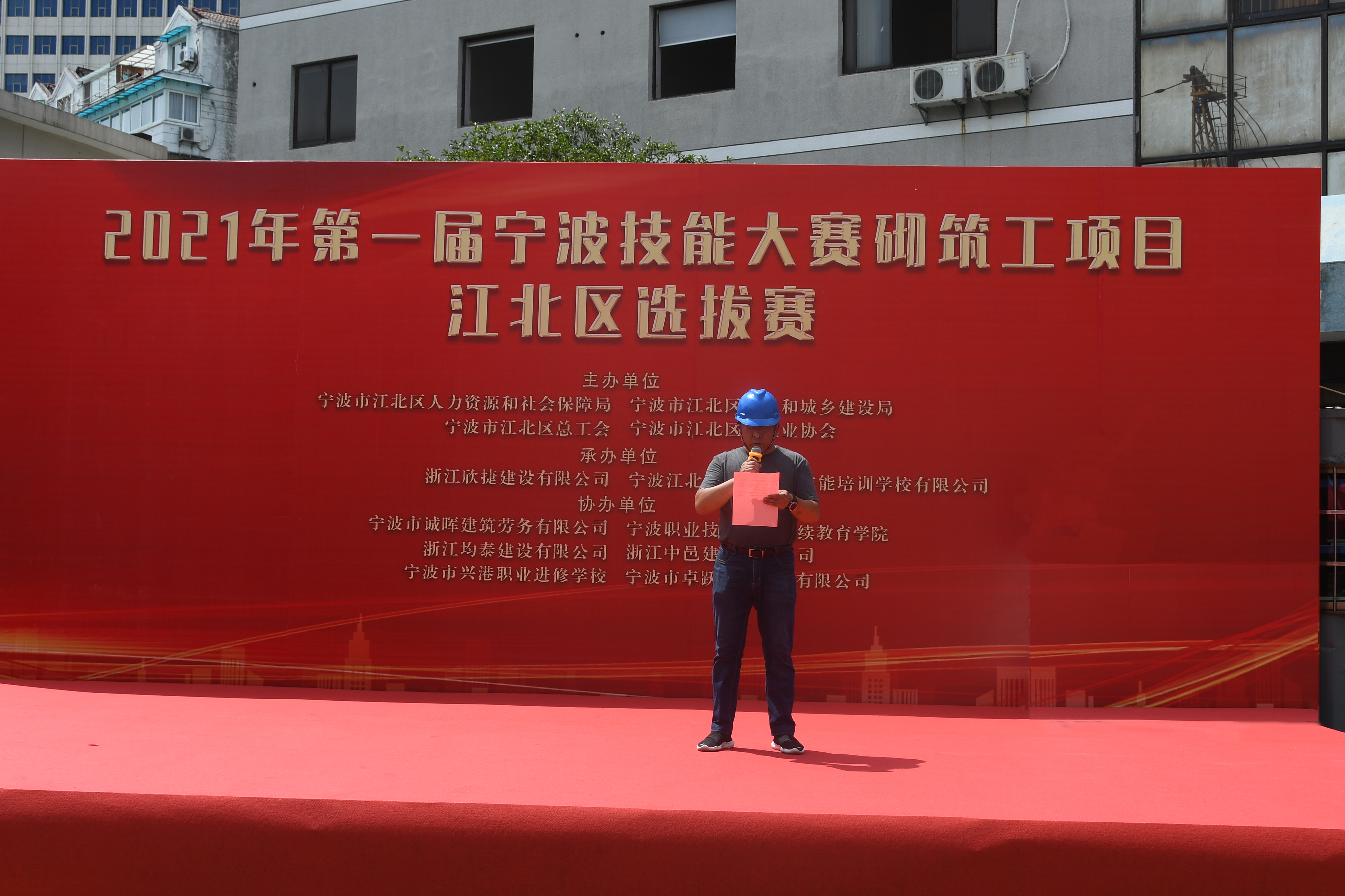 7月16日上午,浙江欣捷建设有限公司、宁波市江北区诚慧职业技能培训学校有限公司作为承办单位,在浙江诚晖人力资源发展集团有限公司与宁波职业技术学院共建的本市技术工人培育基地(新典路46号)组织开展了2021年第一届宁波技能大赛砌筑工项目江北区选拔赛。大赛的主办单位有宁波市江北区人力资源和社会保障局、宁波市江北区住房和城乡建设局、宁波市江北区总工会、宁波市江北区建筑业协会;协办单位有宁波职业技术学院继续教育学院、宁波市兴港职业进修学校、宁波市诚晖建筑劳务有限公司、浙江均泰建设有限公司、浙江中邑建设有限公司、宁波市卓跃教育科技有限公司。