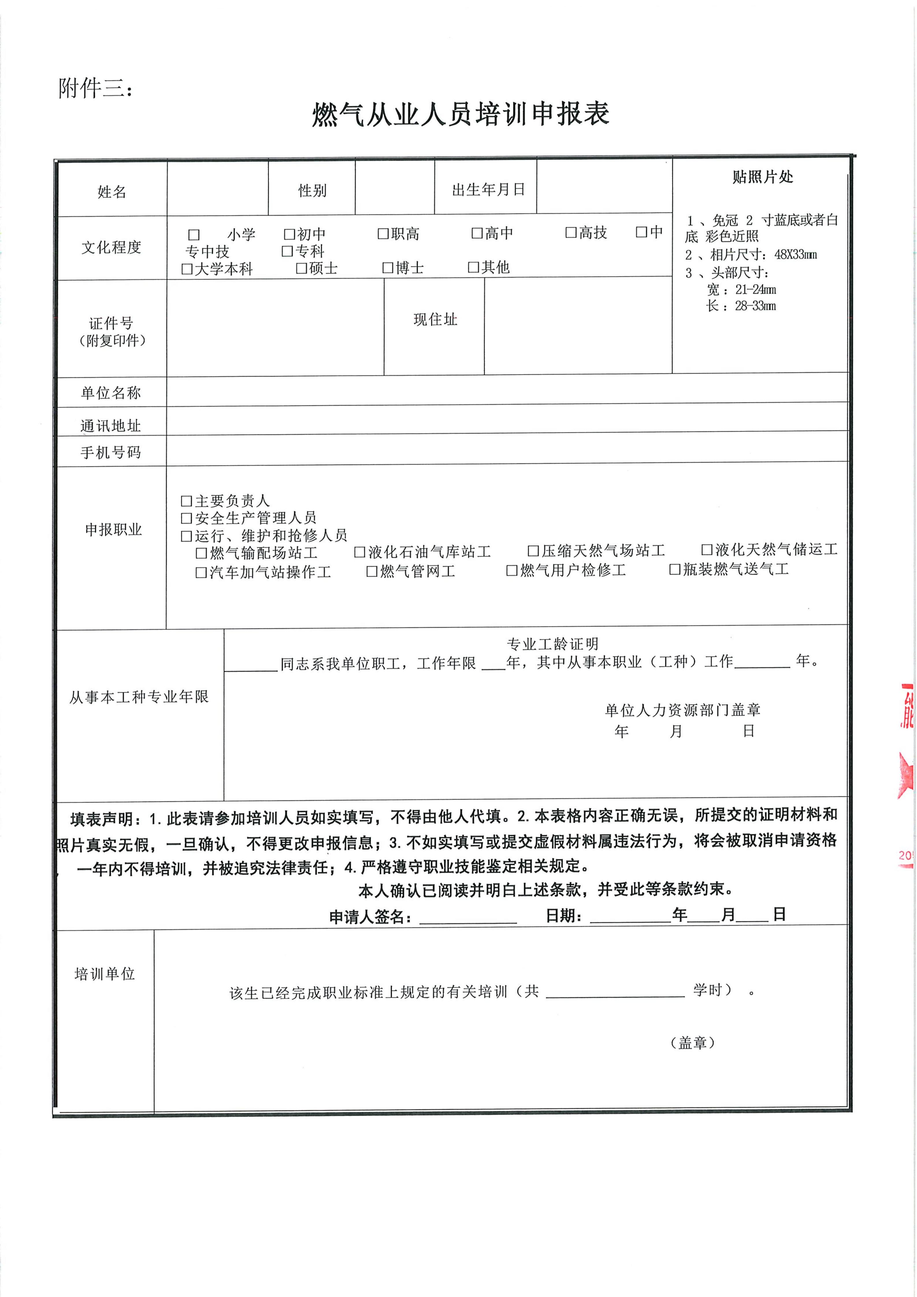 1、拟申请《燃气经营企业从业人员专业培训考核合格证书》的燃气经营企业主要负责人,安全生产管理人员,运行、维护和抢修人员。