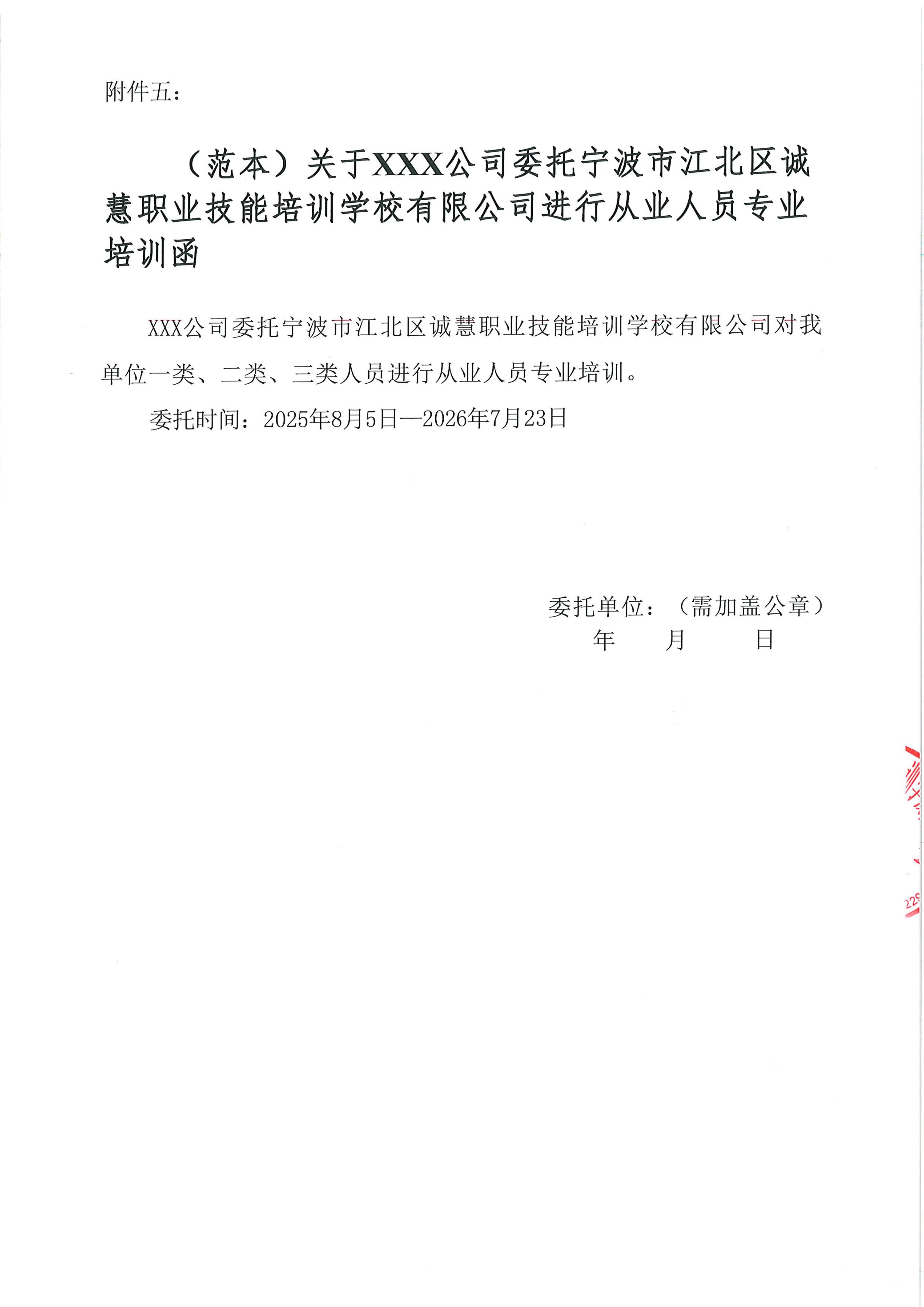附件四:(范本)关于XXX公司人员能力评估和上岗学习证明附附件五:(范本)关于XXX公司委托宁波市江北区诚慧职业技能培训学校有限公司进行从业人员专业培训函