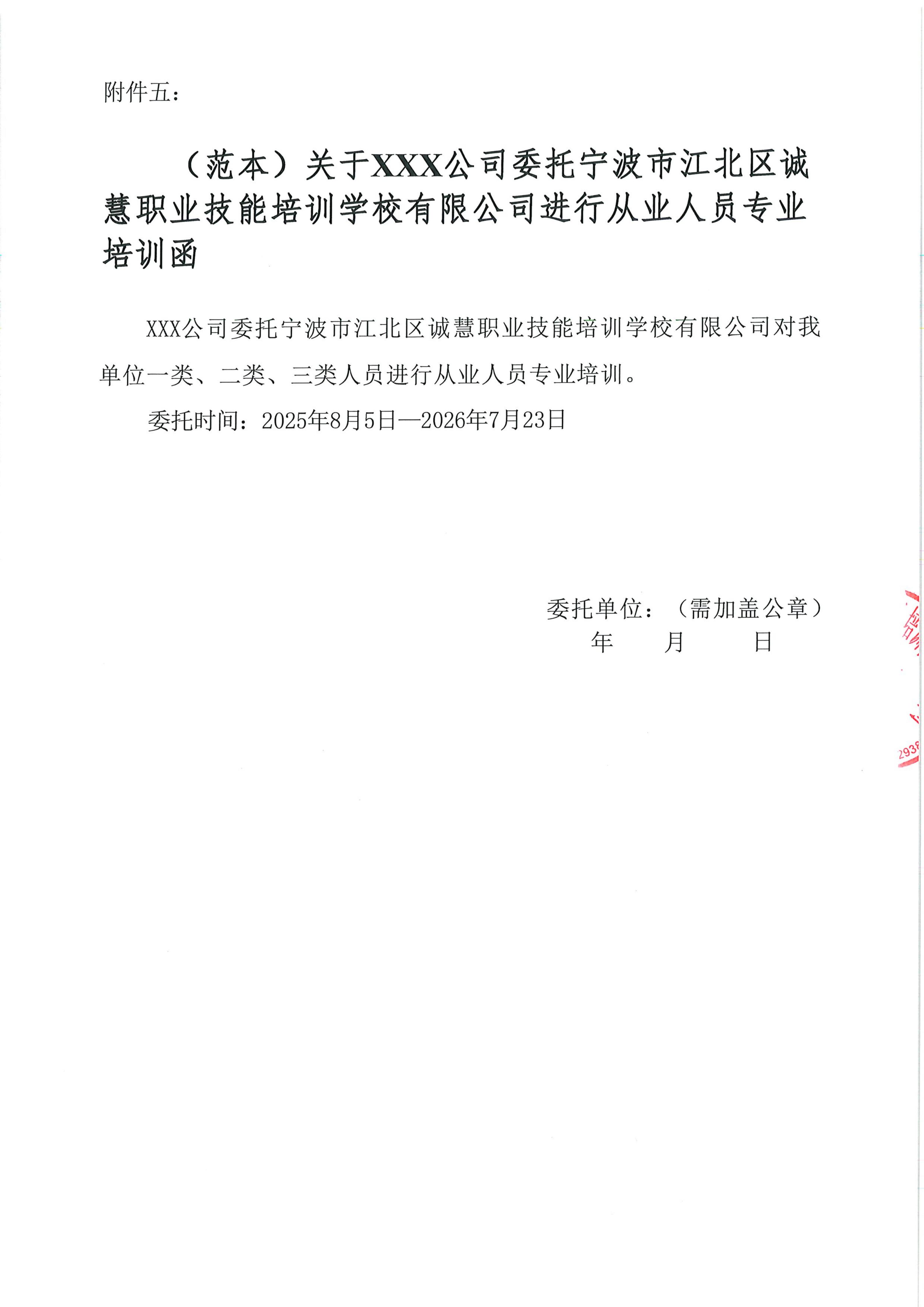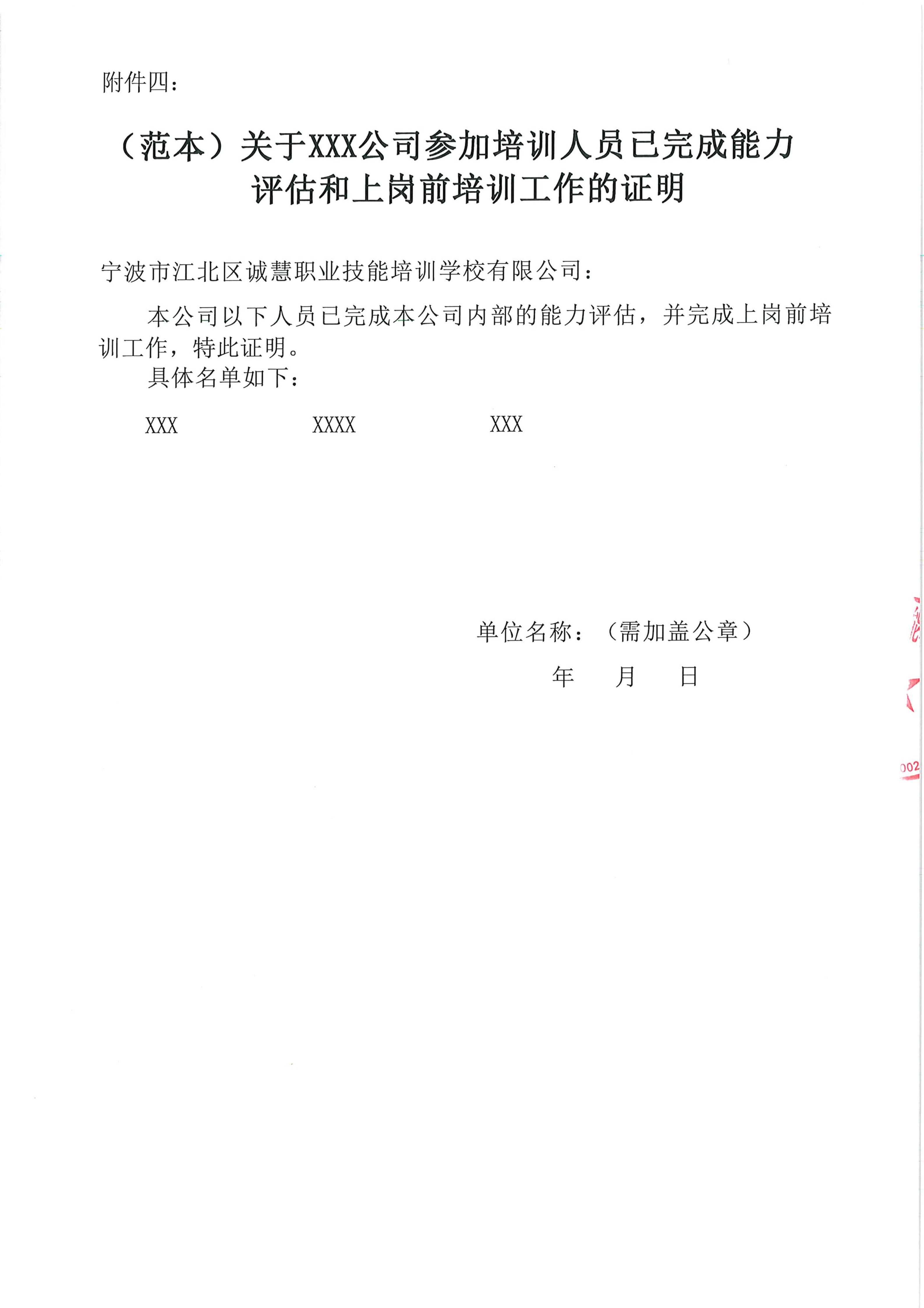 附件四:(范本)关于XXX公司人员能力评估和上岗学习证明附附件五:(范本)关于XXX公司委托宁波市江北区诚慧职业技能培训学校有限公司进行从业人员专业培训函