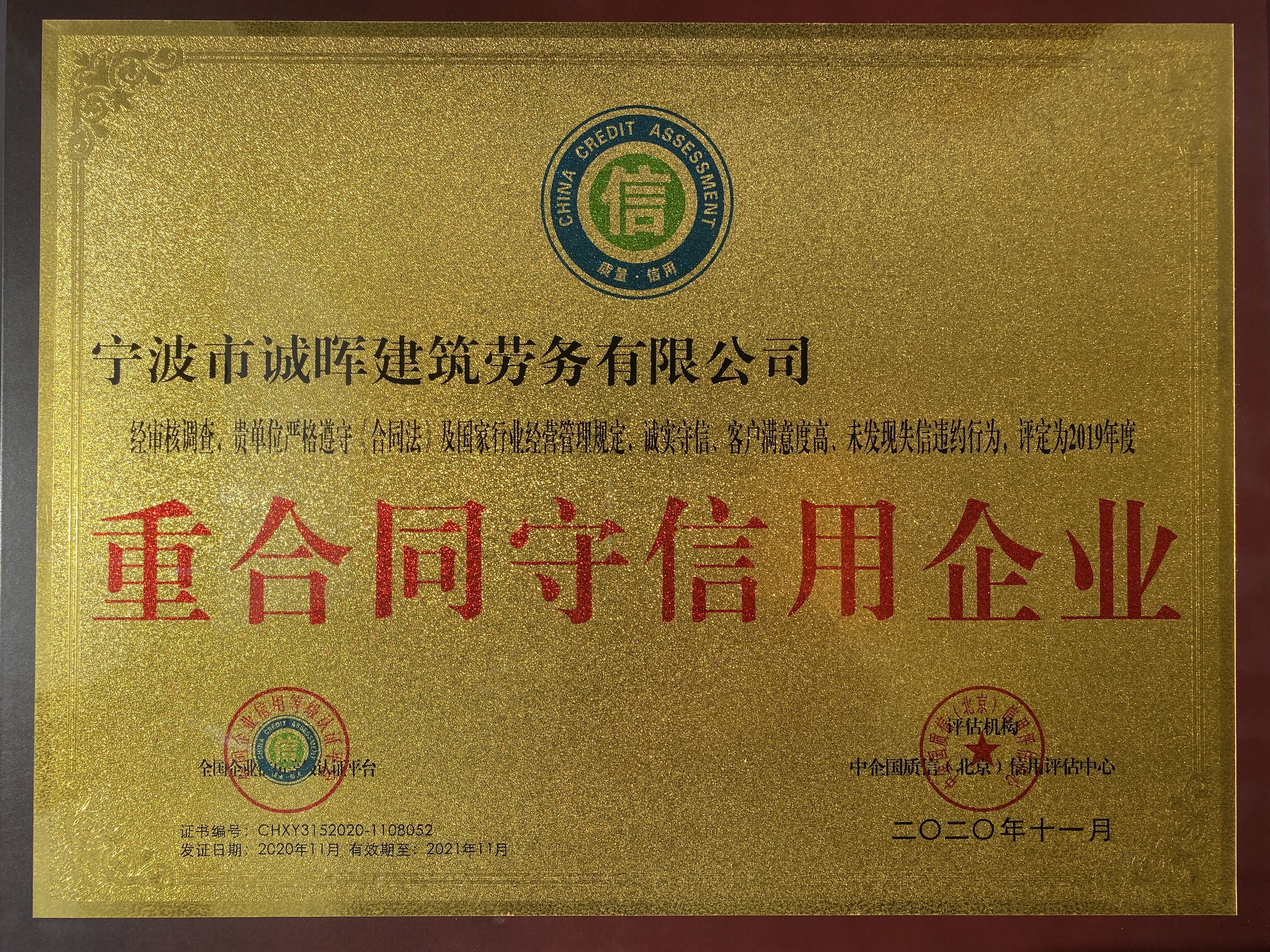 近日,宁波市诚晖建筑劳务有限公司被评定为“2019年度重合同守信用企业”荣誉称号。
