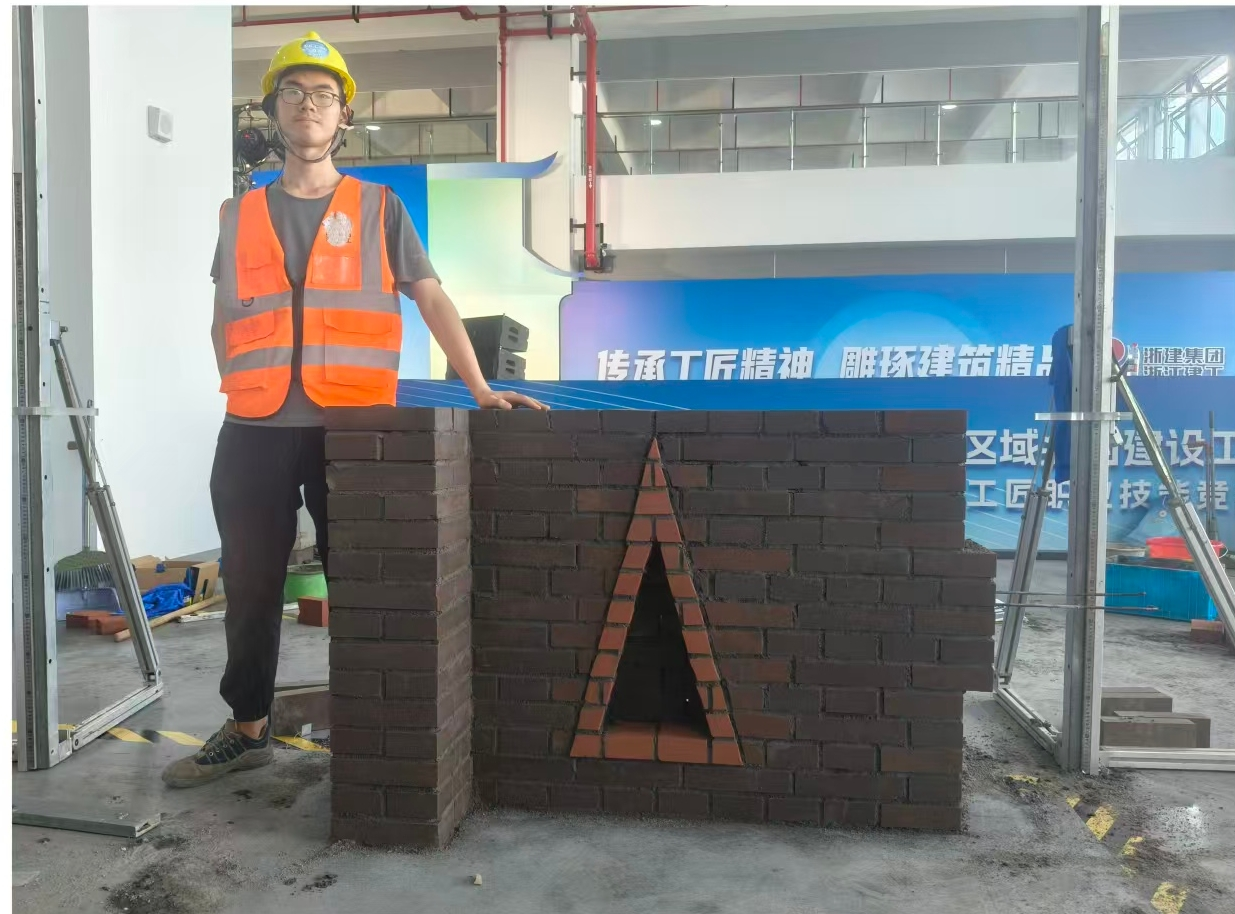 作为代表浙江出征的骨干力量,陈健亮、程孔明在泥瓦工(砌筑)赛项中沉着应战。在持续4小时的纯技能实操比赛中,他们严格把控砖材切割精度、灰缝均匀度与墙面垂直平等多项工艺指标,高质量完成乡村小型景墙的砌筑任务,展现出扎实的专业功底和严谨的工匠精神。