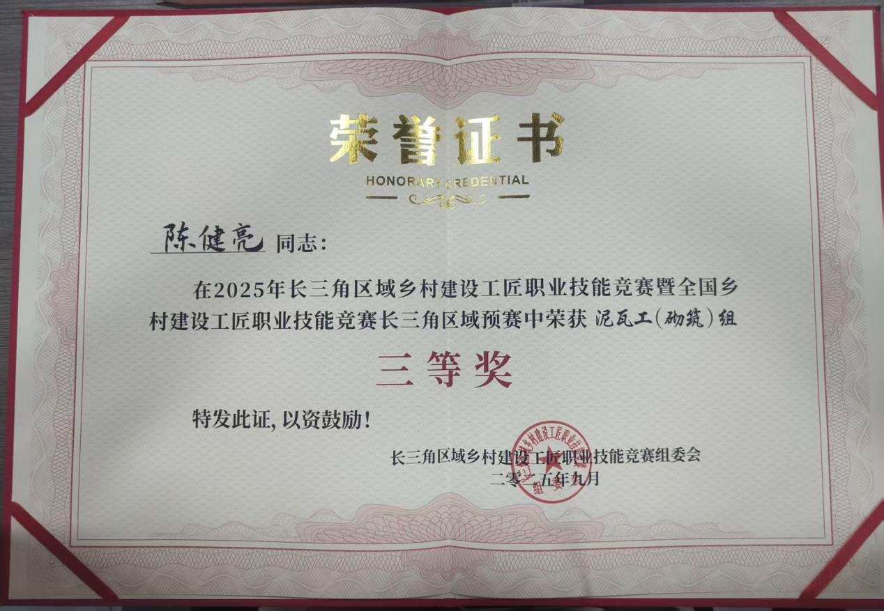 9月25日,2025年长三角区域乡村建设工匠职业技能竞赛于浙江嘉善圆满落幕,诚晖集团旗下宁波市诚晖建筑劳务有限公司选派的两名优秀工匠——陈健亮、程孔明,凭借精湛技艺与稳定发挥,分别荣获泥瓦工(砌筑)赛项三等奖和优胜奖,为浙江省代表队赢得荣誉,彰显了“诚晖工匠”的品牌实力。