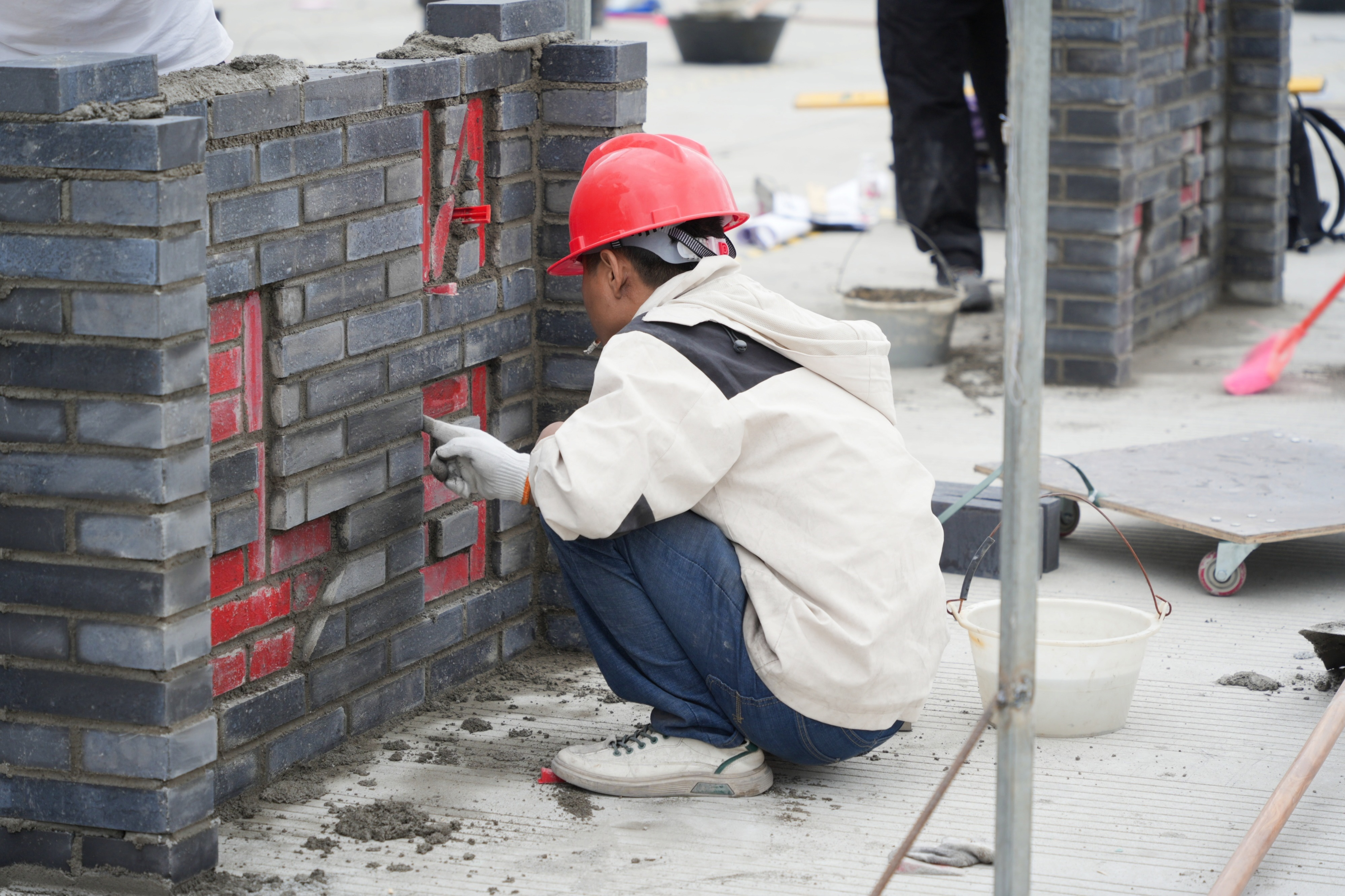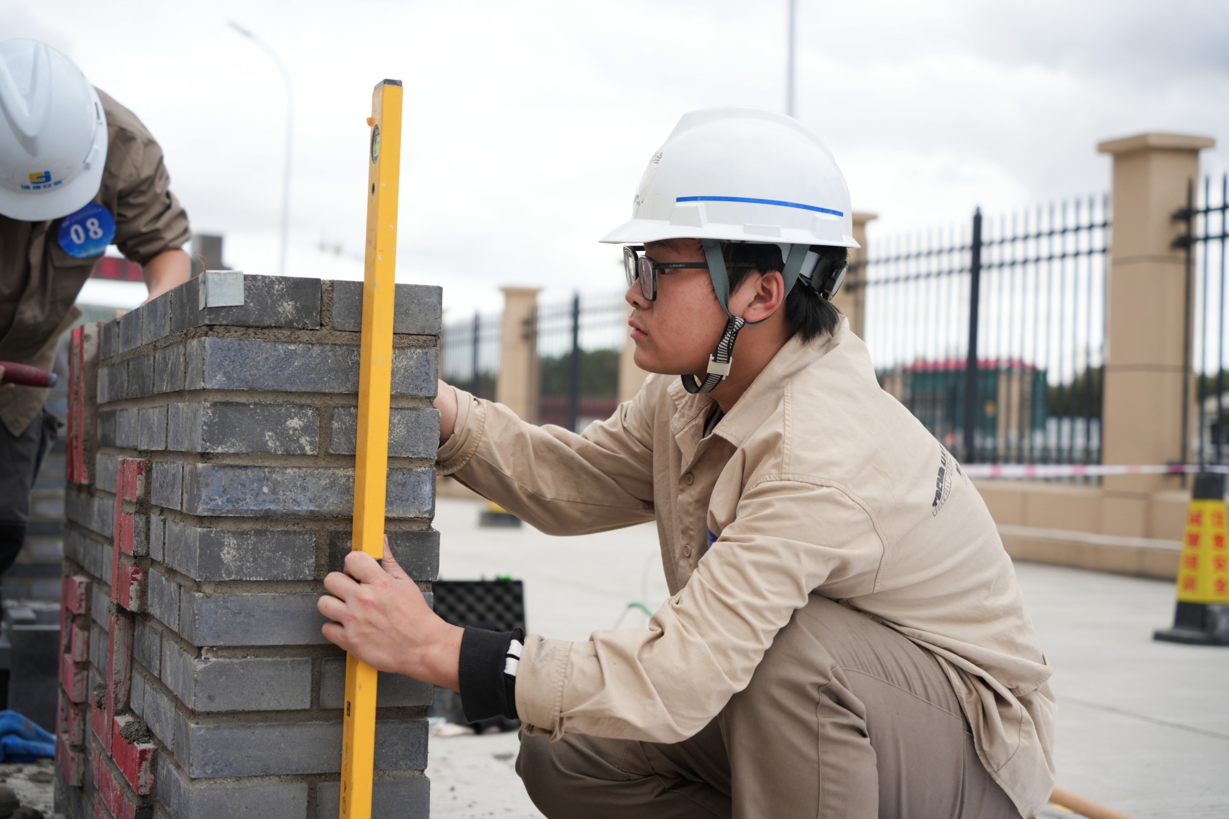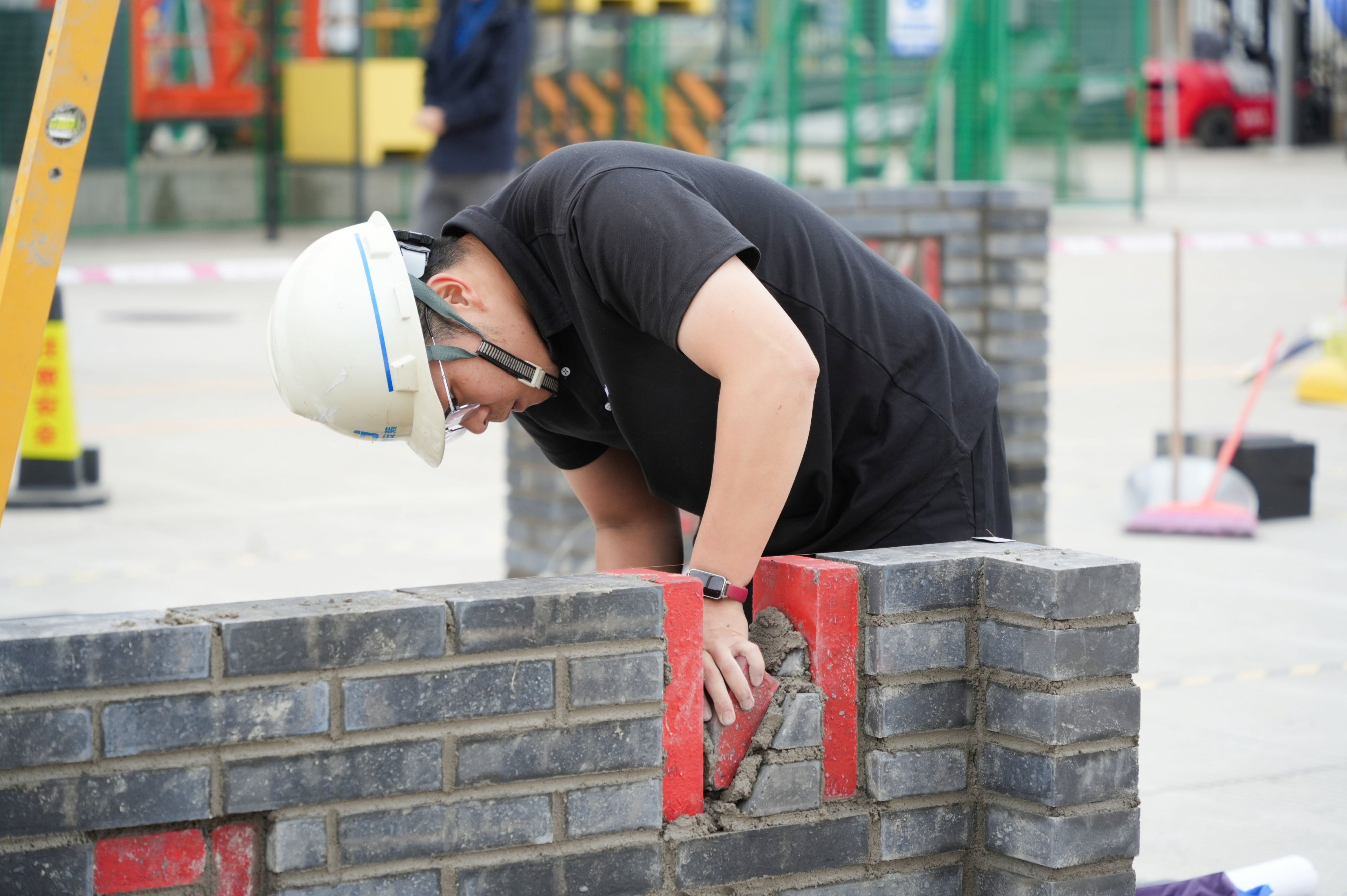 在随后的实操考核现场,选手们手持瓦刀、线锤等工具,在和灰、铺浆、砌砖、勾缝等环节中展现出了扎实的基本功。有的专注校准墙体垂直度,有的精心调整灰缝厚度,整个赛场砂浆飞溅、砖墙渐起,严谨的施工流程与娴熟的操作手法相得益彰,充分体现了建筑行业“精益求精”的工匠精神。