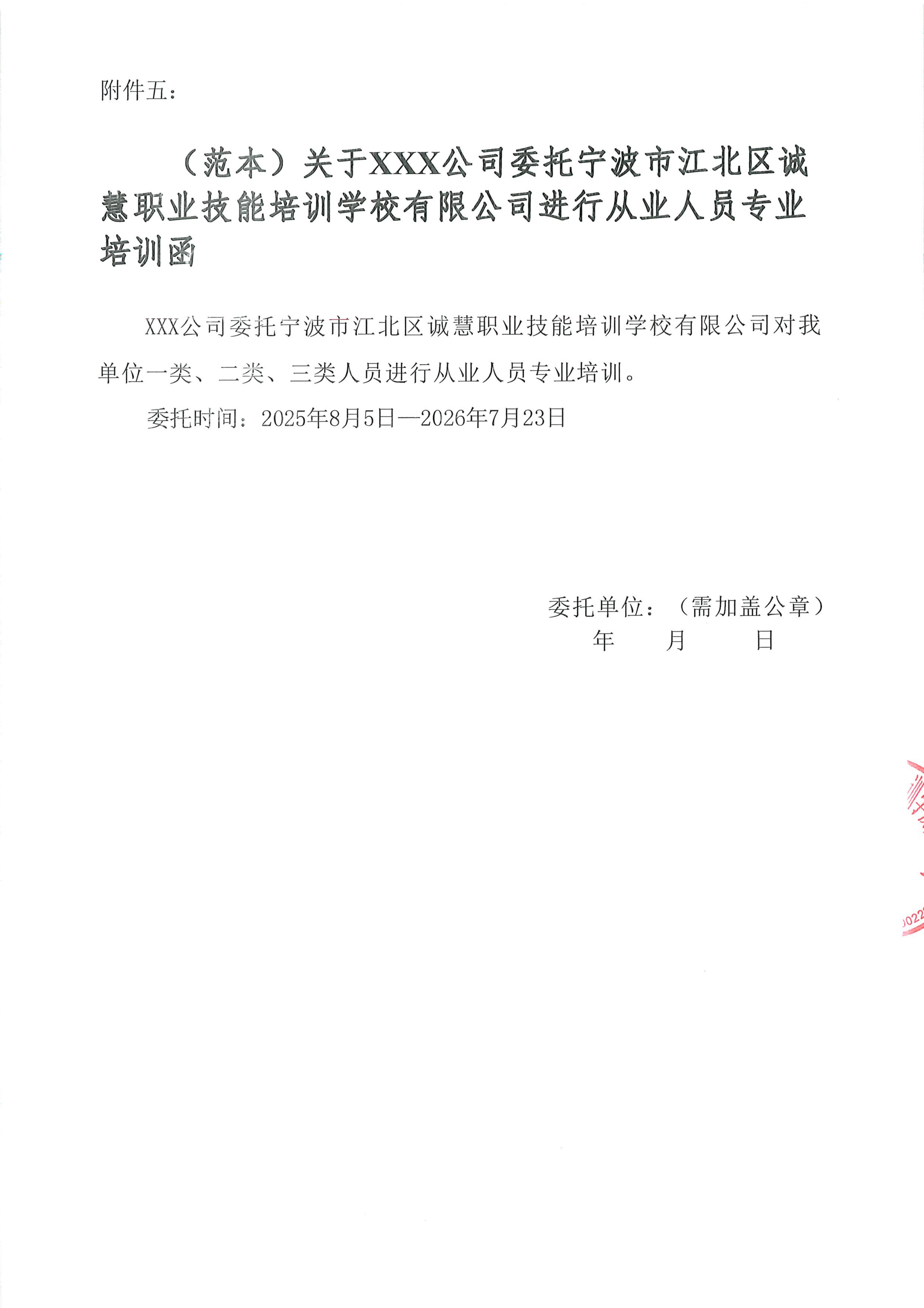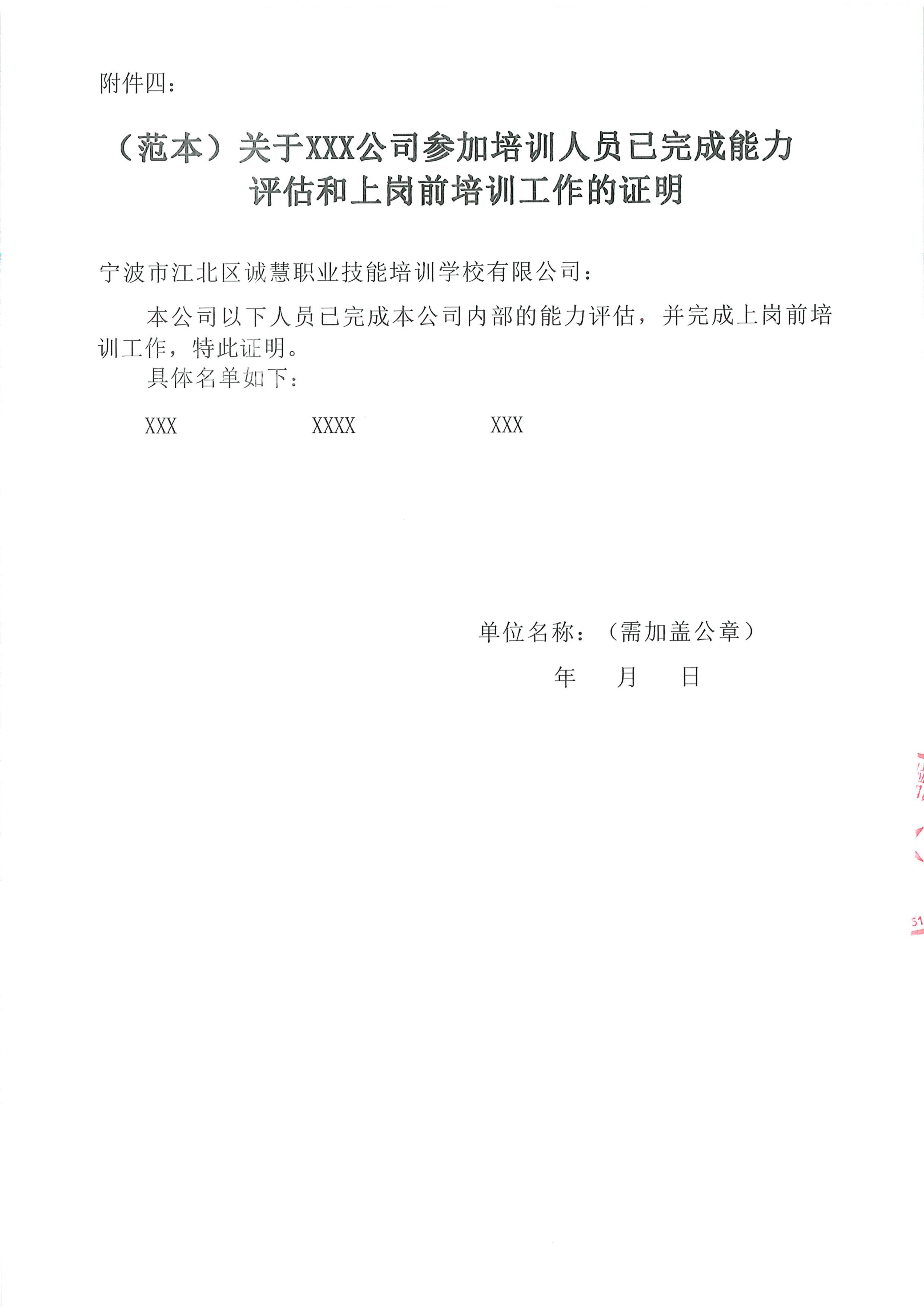 附件四:(范本)关于XXX公司人员能力评估和上岗学习证明附附件五:(范本)关于XXX公司委托宁波市江北区诚慧职业技能培训学校有限公司进行从业人员专业培训函