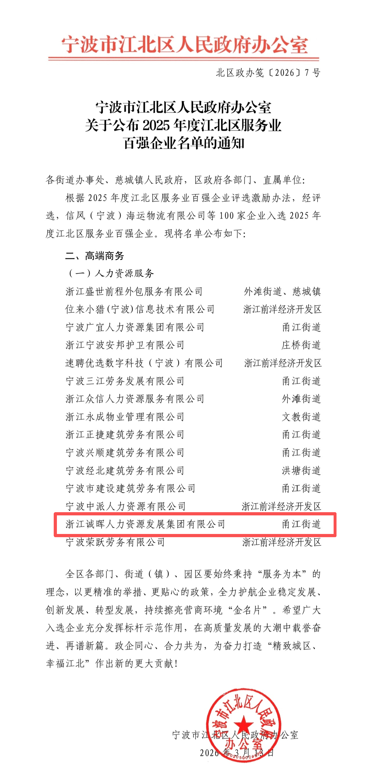 2026年3月19日,宁波市江北区人民政府办公室正式发布《关于公布2025年度江北区服务业百强企业名单的通知》。经综合评定,浙江诚晖人力资源发展集团有限公司再次入选,连续多年跻身区域服务业百强行列。