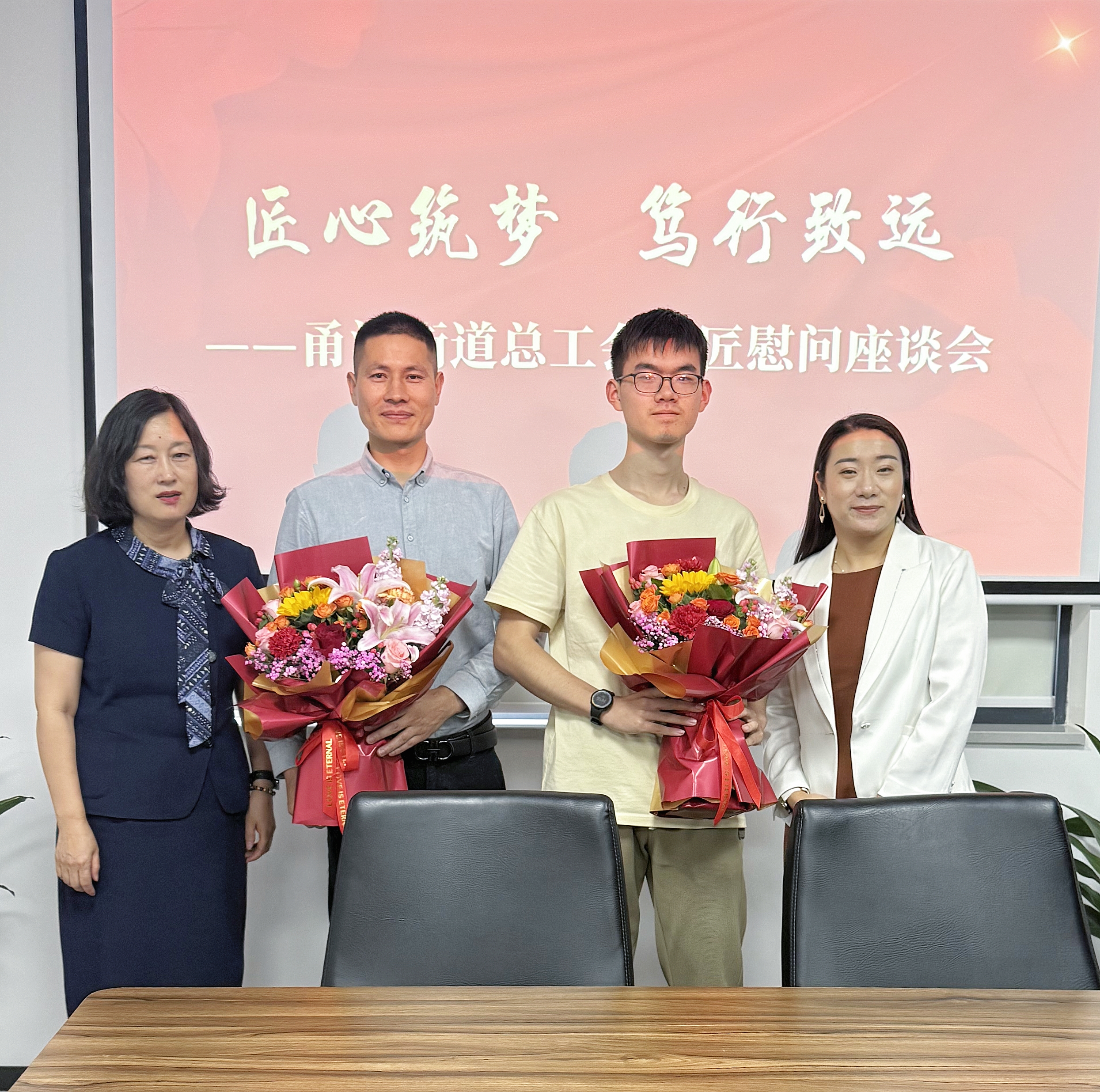 4月29日,甬江街道总工会郑主席一行带着满满的关怀与祝福为集团工匠程孔明、陈健亮送上慰问礼品,并对工匠们的辛勤付出给予肯定。随后,郑主席与集团副总经理张燕楠以及两位工匠一同走进会议室,开展了慰问座谈会。
