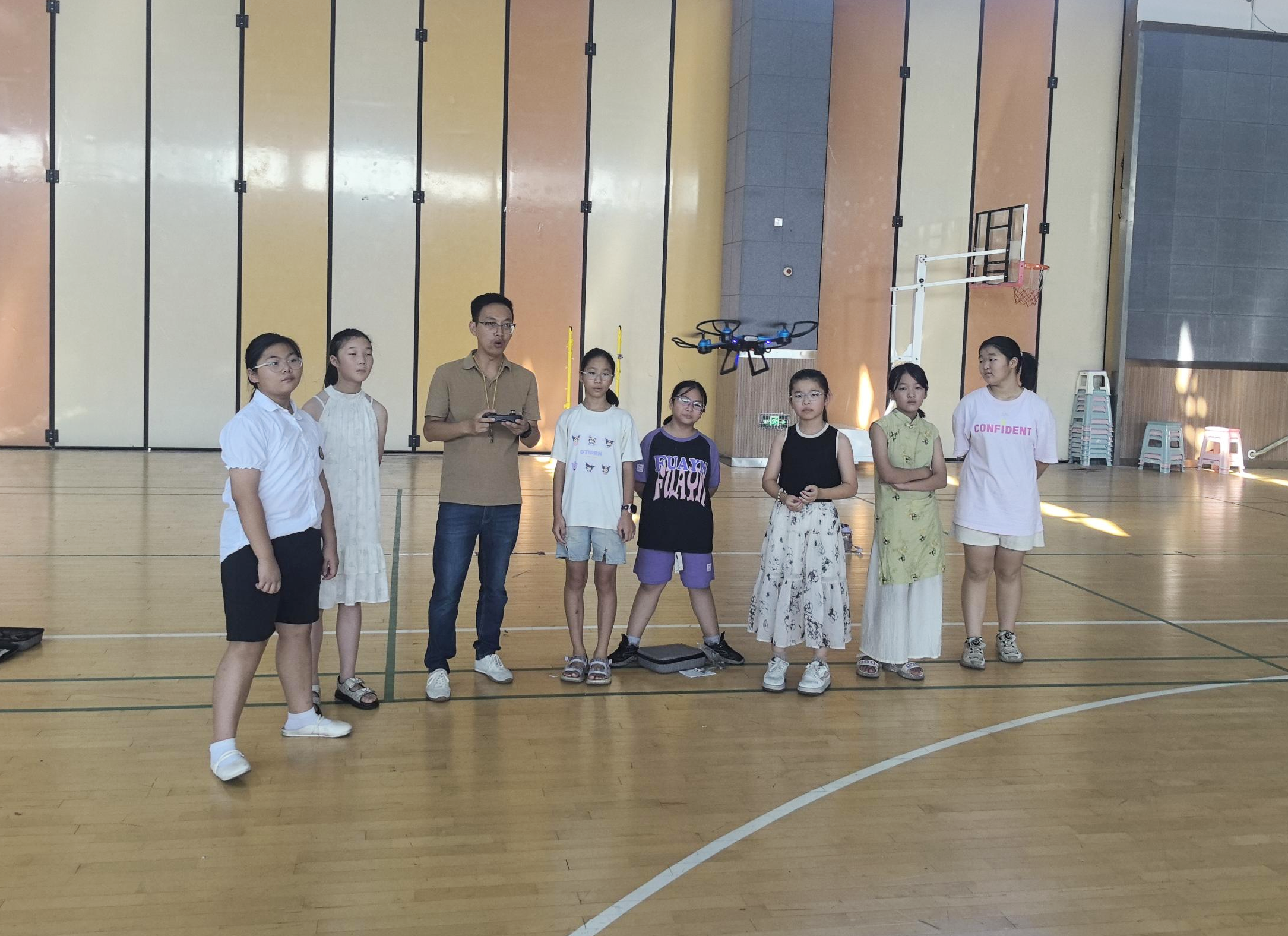 理论学习结束后,实操训练转移到了更为宽敞的体育馆内进行。教练团队首先为孩子们带来了一场无人机飞行演示。精准的悬停、流畅的航线飞行、精彩的花式动作,每一个操作都引发孩子们阵阵惊叹和热烈掌声。