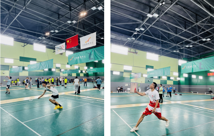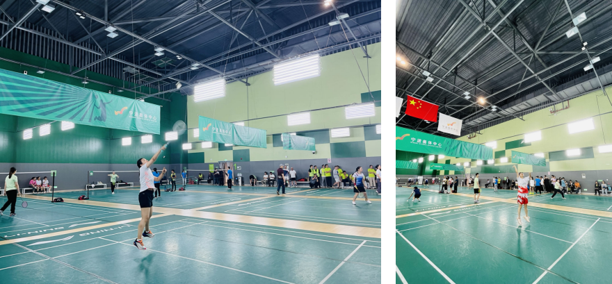 同时,羽毛球比赛也如火如荼地进行,副总经理张燕楠、财务部副经理胡雪菲在女单比赛中奋力拼搏,朱翌玮、陆啸晨在男单赛场上斗志昂扬,发球、吊球、扣杀、扑救,羽毛球在场馆上空划出一道道美丽的弧线。