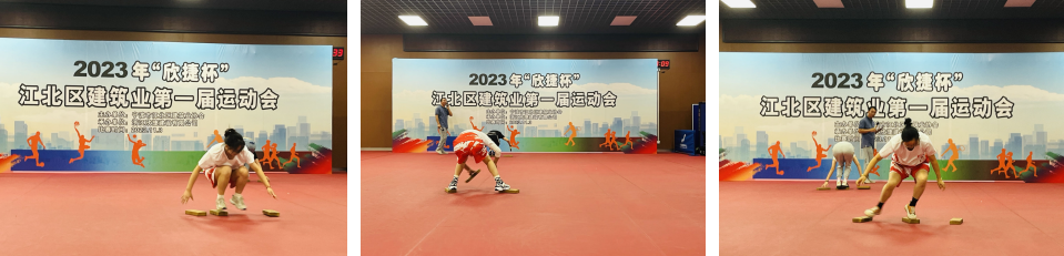 哪怕是午休时间,参加下午团体赛的队员们也早早地集合商量对策,为比赛尽最后的努力。13时30分,趣味比赛摸石头过河准时开赛,诚晖集团的单巧敏、卢昊天、蔡剑芳、何强、蒋丽娟、董华飞依次出场,在第二轮与另外两支队伍同场竞技。队员们站于起跑线后的第1、2块木砖上,手拿第3块木砖等候发令,哨声一响,依次将木砖踩在脚下交替向前行进。团体赛吸引到所有公司的助威人群,诚晖集团队员们全神贯注投入比赛的同时,我们的啦啦队员发出此起彼伏的加油鼓励声,成为上下一心的动人诠释。