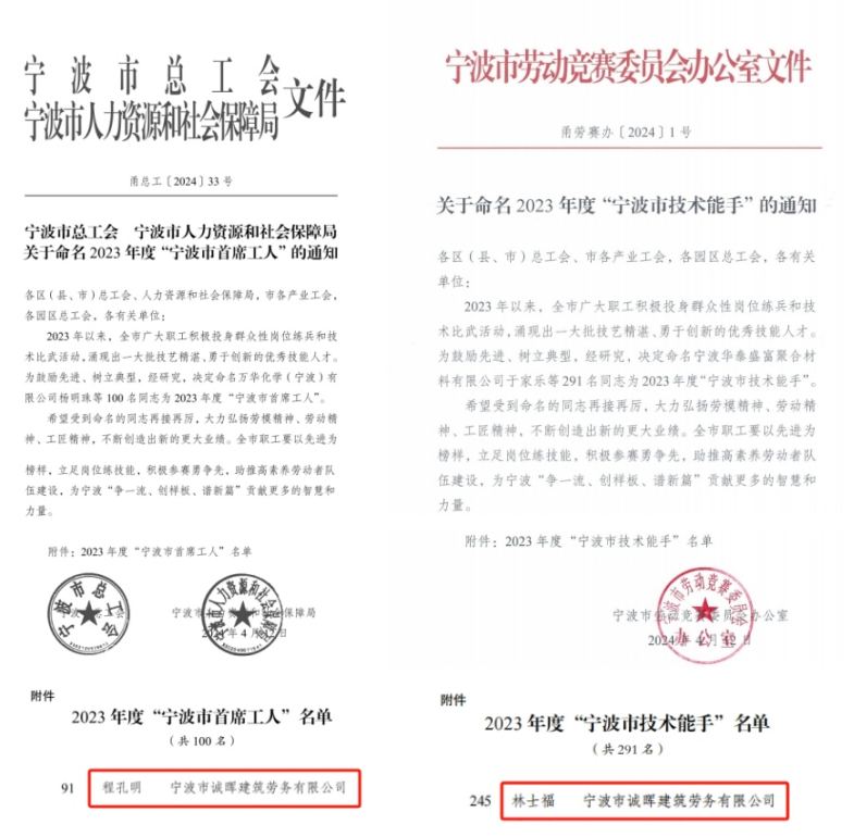 4月12日,宁波市总工会、宁波市人力资源和社会保障局印发《关于命名 2023年度“宁波市首席工人”的通知》(甬总工﹝2024﹞33号),宁波市劳动竞赛委员会办公室印发《关于命名 2023年度“宁波市技术能手”的通知》(甬劳赛办〔2024﹞1号),宁波市诚晖建筑劳务有限公司员工程孔明、林士福分别荣获市级“首席工人”、“技术能手”荣誉称号。