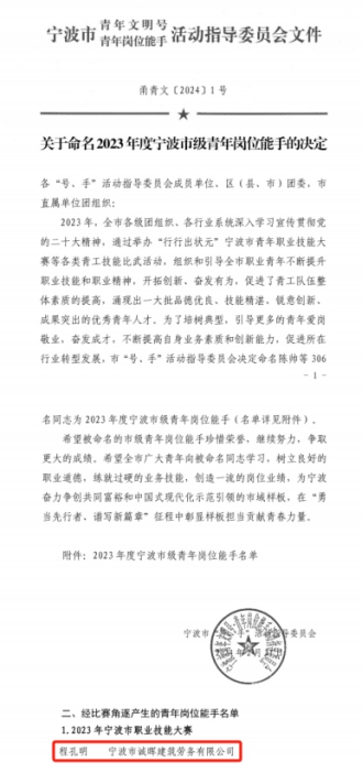 近日,宁波市青年文明号青年岗位能手活动指导委员会印发了《关于命名2023年度宁波市级青年岗位能手的决定》﹝甬青文(2024)1号﹞,宁波市诚晖建筑劳务有限公司员工程孔明成功获评市级“青年岗位能手”荣誉称号。