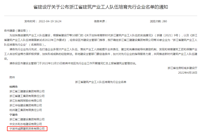 诚晖公司被推荐为“浙江省建筑产业工人队伍培育先行企业”