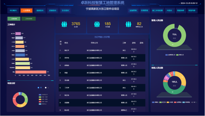 卓跃智慧工地平台人员实名制管理:卓跃劳务通可掌握企业信息、人员实名制考勤、工人证件管理、工种类型统计、合同管理、考勤汇总、安全教育、证书管理等,软件自动生成劳务花名册,为劳务管理人员提供业务资料支持。