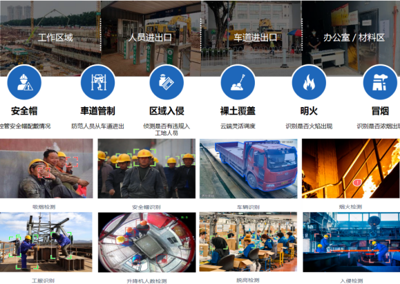 AI算法盒子:通过在前端摄像头选择合适点位植入对应AI算法进行分析,判断施工人员是否存在不安全行为,具有多个功能可选,例如安全帽识别、反光背心识别、区域入侵识别、火焰识别、烟雾识别等,进行图像识别后自动分析与预警。