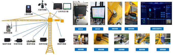 塔吊安全监控管理系统:通过在每台塔吊上安装防碰撞监视设备,配备塔吊“黑匣子”,可远程高速无线传输,对重量、高度、幅度、力矩、回转及风速等参数数据进行记录显示,实现塔吊运行实时动态的远程监控、全过程监控。