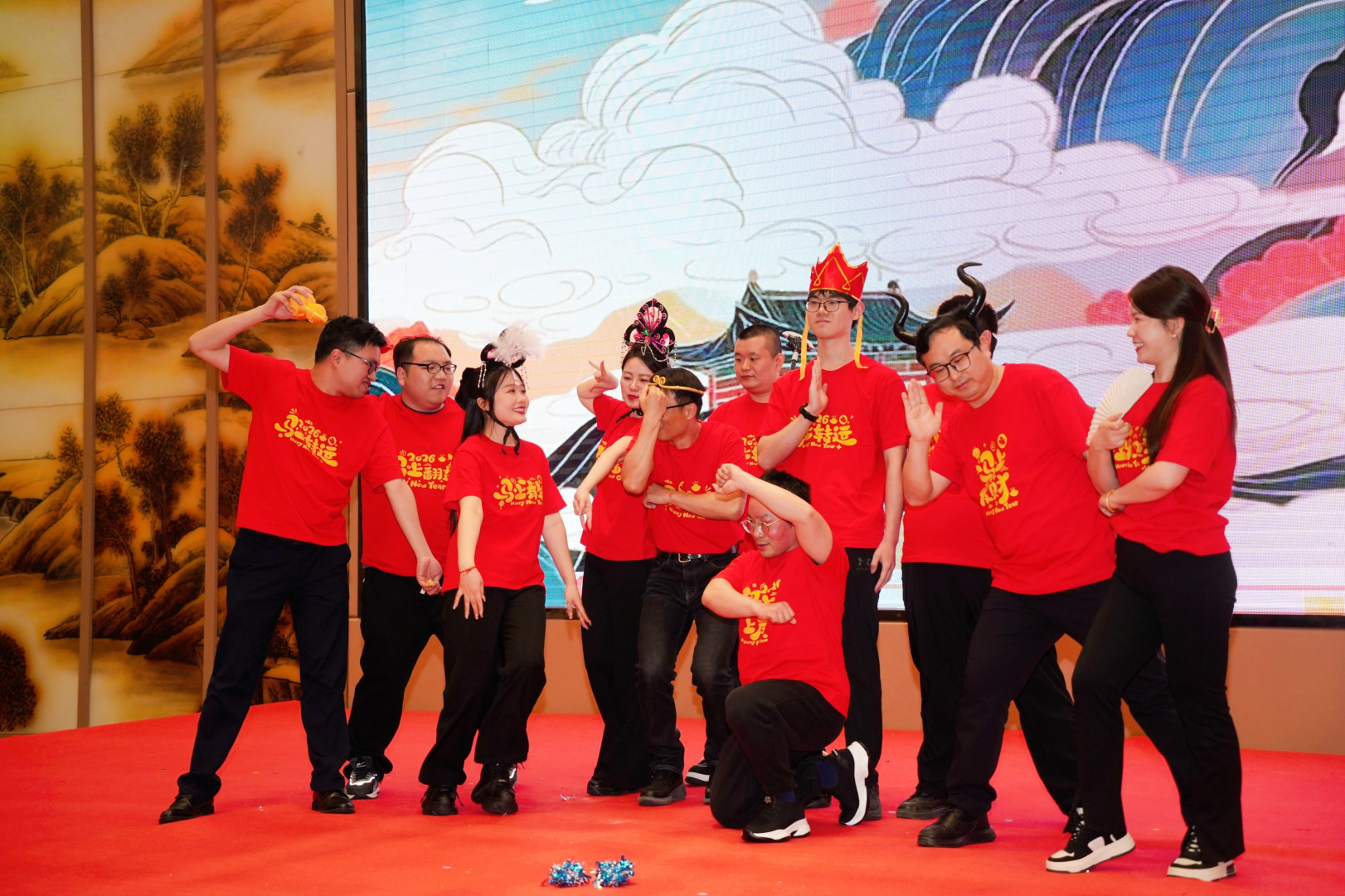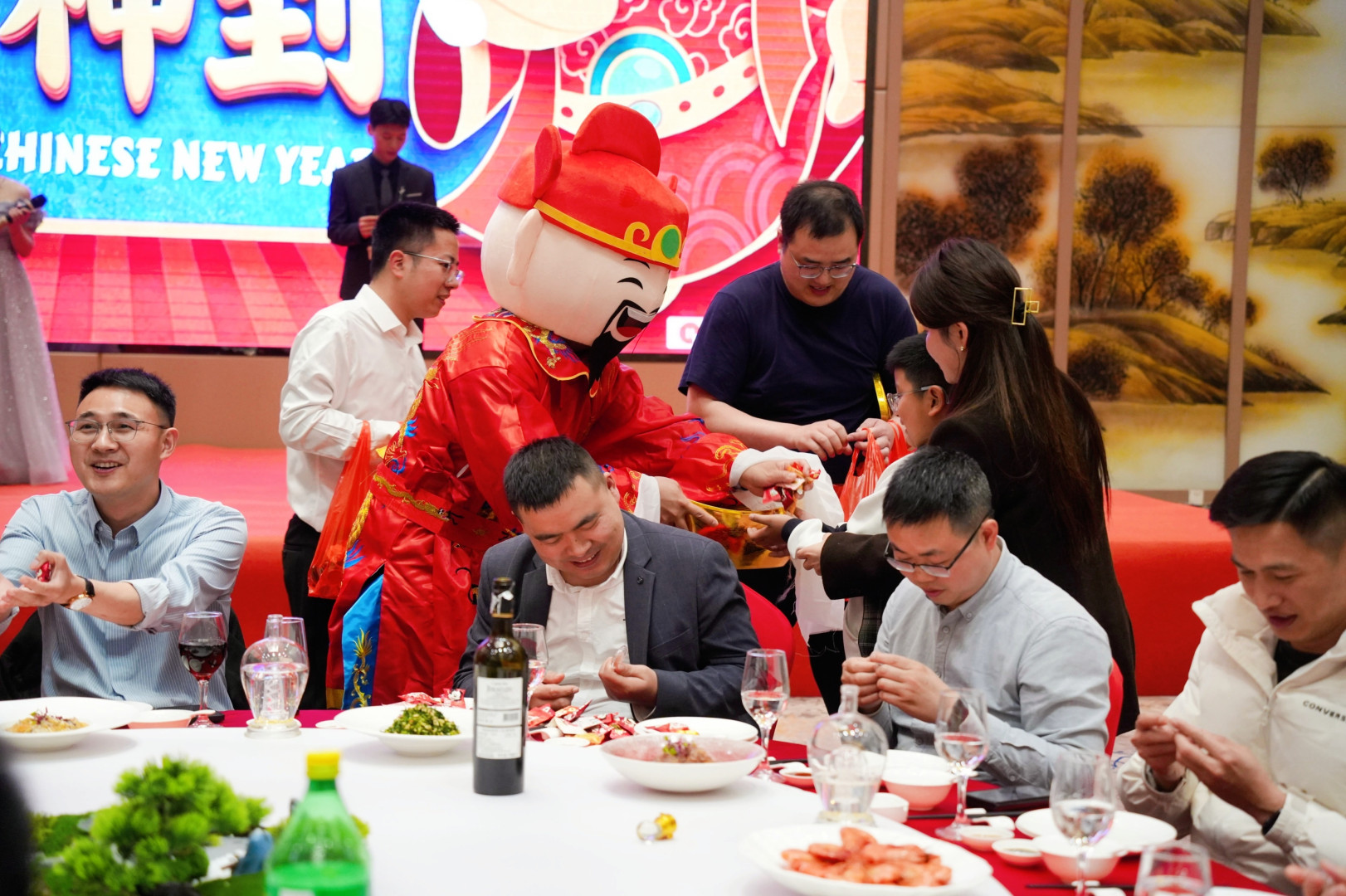 晚宴在四位主持人的热情开场中拉开帷幕。“财神爷”惊喜登场,以热闹喜庆的撒糖环节点燃全场欢乐的氛围,为员工们送上生活甜甜蜜蜜、事业蒸蒸日上的美好祝福