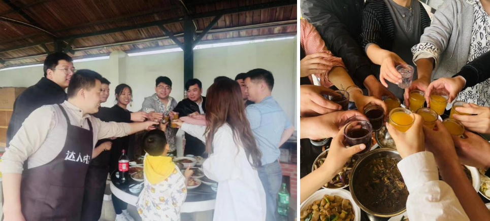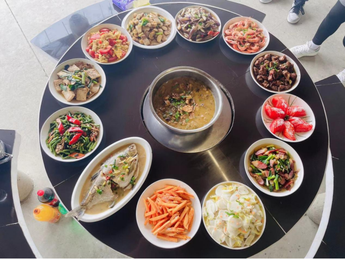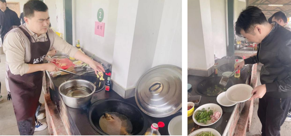 本次活动共14支企业队伍参加,每支队伍的十名成员需共同烹饪一桌美味,待烹饪完成后由评委进行现场打分。虽然每支队伍都是非专业大厨,但是竞争却相当激烈,各种状况也是层出不穷。有时由于一起洗菜导致水压不足,腿脚快的队员们提着菜、拿着盆来回飞奔50米外的水龙头洗菜,大家笑称厨艺比拼改成了田径比赛;土灶点火也相当有挑战性,大家网上搜教程现学现卖,火是点着了,脸却黑了;炒菜环节也很精彩,十八般武艺各显神通,有的拿锅铲炒菜,锅铲不够的拿水瓢炒,引来一片笑声;菜系就更丰富了,川菜系,浙菜系,最精彩的就是自研系,作为著名非职业大厨什么食材都可以混在一起炒,主打的就是随心所欲。经过大厨们的团结协作和发明创造,十盘菜品陆续上桌,大家围坐在一起享用着午餐,一致认为自己做的最好吃,这也印证了那句古话,自己动手丰衣足食。